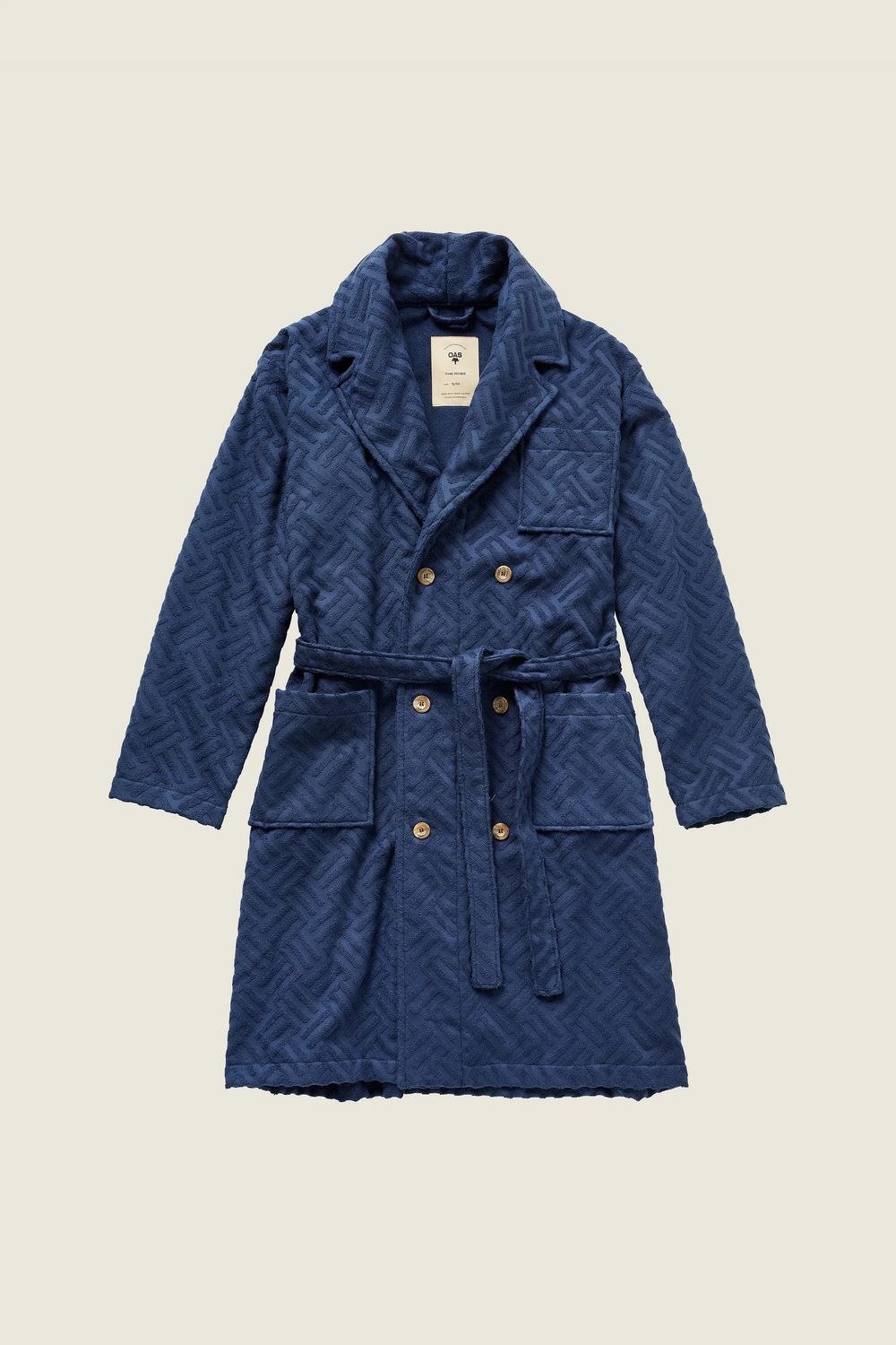 Der royalblaue, doppelreihige Bademantel eignet sich sowohl zum An- als auch zum Ausziehen. Der Bademantel aus 100% jacquardgewebtem Frottee hat eine großzügige Passform, einen Resortkragen und drei Taschen, darunter eine Brusttasche. Der knielange Bademantel wird in Portugal hergestellt und in Stockholm entworfen.