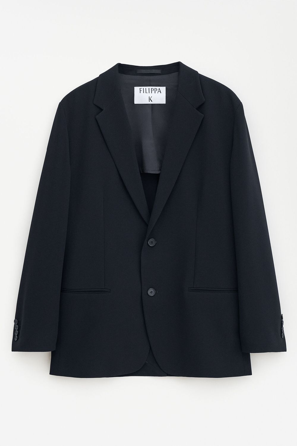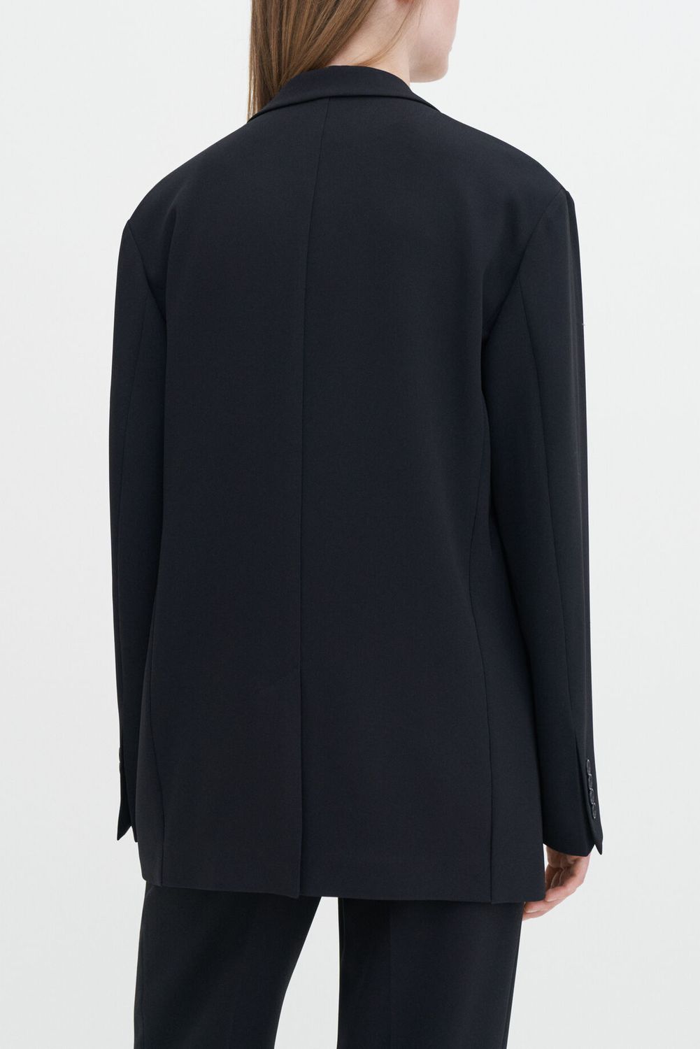 Der lässige Blazer hat eine lockere Passform und ist aus einer mittelschweren, matten Triacetatmischung in Schwarz gefertigt. Das unkonstruierte Modell hat einen einreihigen Knopfverschluss und reicht über das Gesäß.