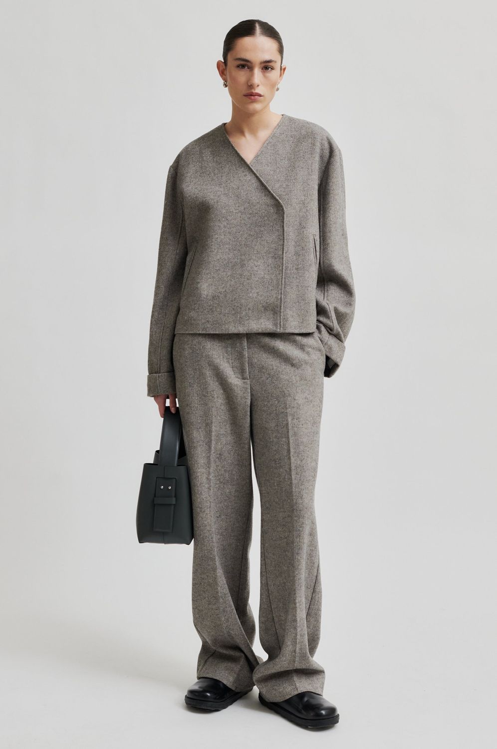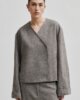 Second Female Crossover-Blazer. Hergestellt aus einer leichten Wollmischung mit Miniatur-Fischgrätmuster. Mit überkreuztem Ausschnitt, der auf einer Seite mit verdeckten Druckknöpfen geschlossen wird. Zwei Seitentaschen. Überschnittene Schultern und lange Ärmel mit doppeltem Saum an den Manschetten. Vollständig gefüttert. Normale, gerade Passform.