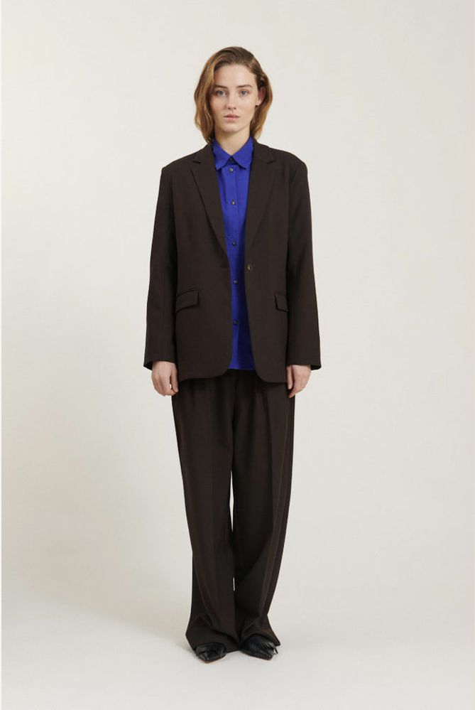 Der Marjorie Blazer zeichnet sich durch einen lockeren Schnitt, einen Reverskragen und Taschen aus. Kombiniere ihn mit der passenden Marjorie Hose.