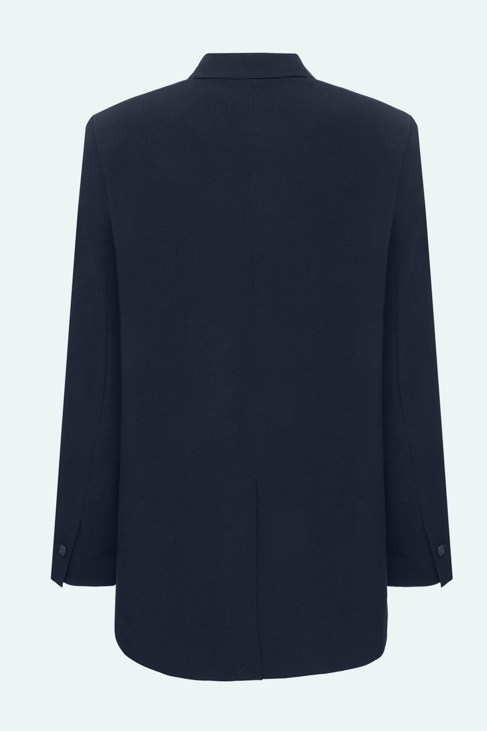 Novi ist ein moderner, klassischer Blazer mit tailliertem Look und besteht aus 79 % recyceltem Polyester, 17 % Viskose und 4 % Elasthan. Der Blazer hat eine leicht übergroße Passform und verfügt über Schulterpolster sowie einen minimalistischen Reverskragen. Er ist mit einem einzelnen Knopf, Taschen und einem Schlitz am Rücken versehen. Das Model ist 180 cm groß und trägt Größe 36.