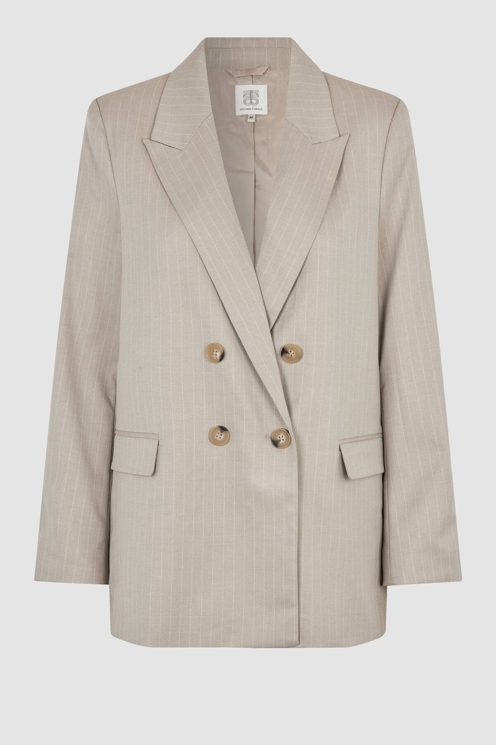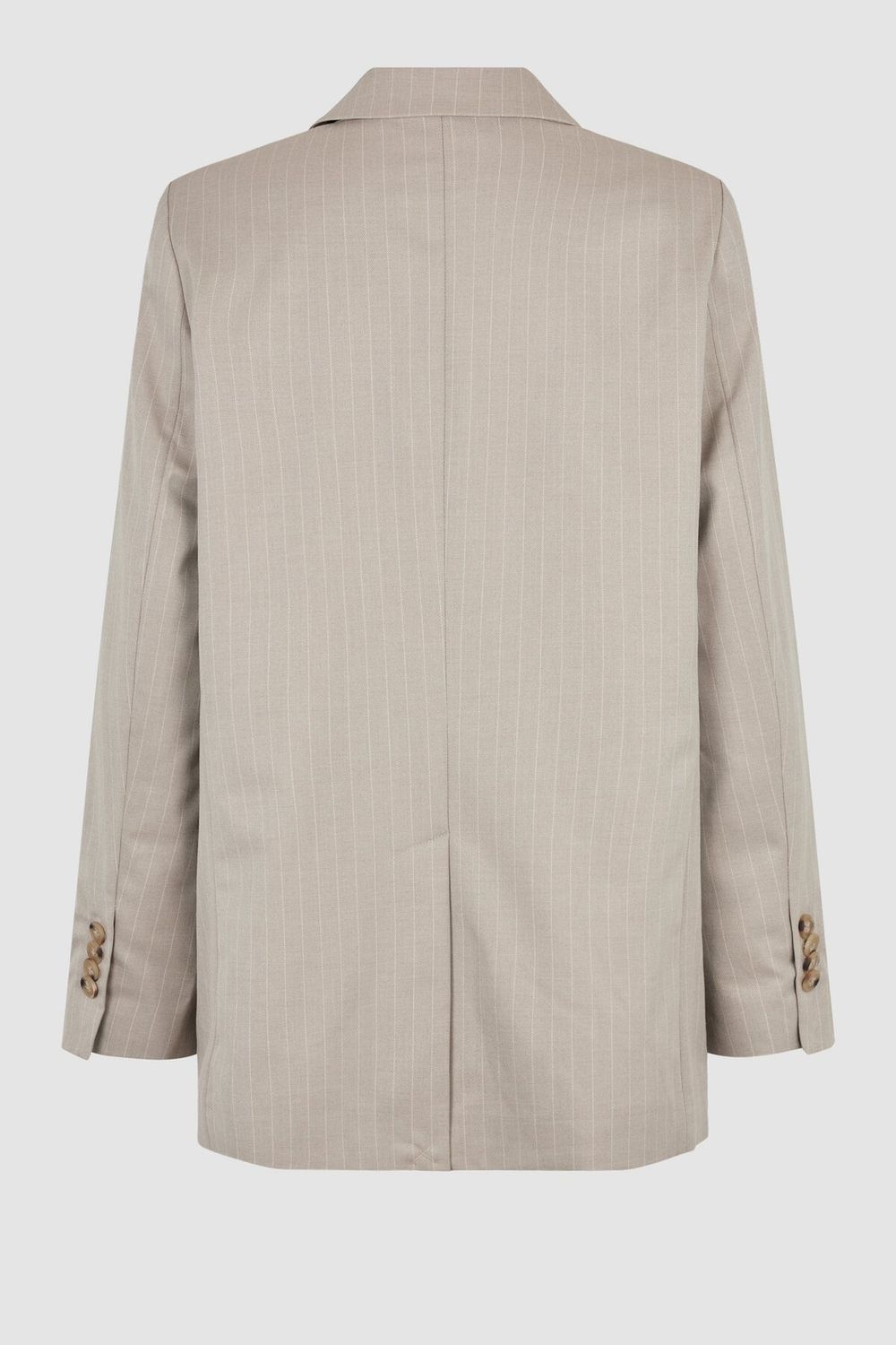 Weiblicher Blazer mit Nadelstreifen. Aus weichem und glattem Stoff mit klassischen Nadelstreifen. Mit Spitzrevers und zweireihigem Verschluss mit vier Knöpfen. Zwei Pattentaschen auf der Vorderseite. Knopfverschluss an den Manschetten. Gepolsterte Schultern und Schlitz am Rücken. Vollständig gefüttert. Entspannte, fließende Passform.