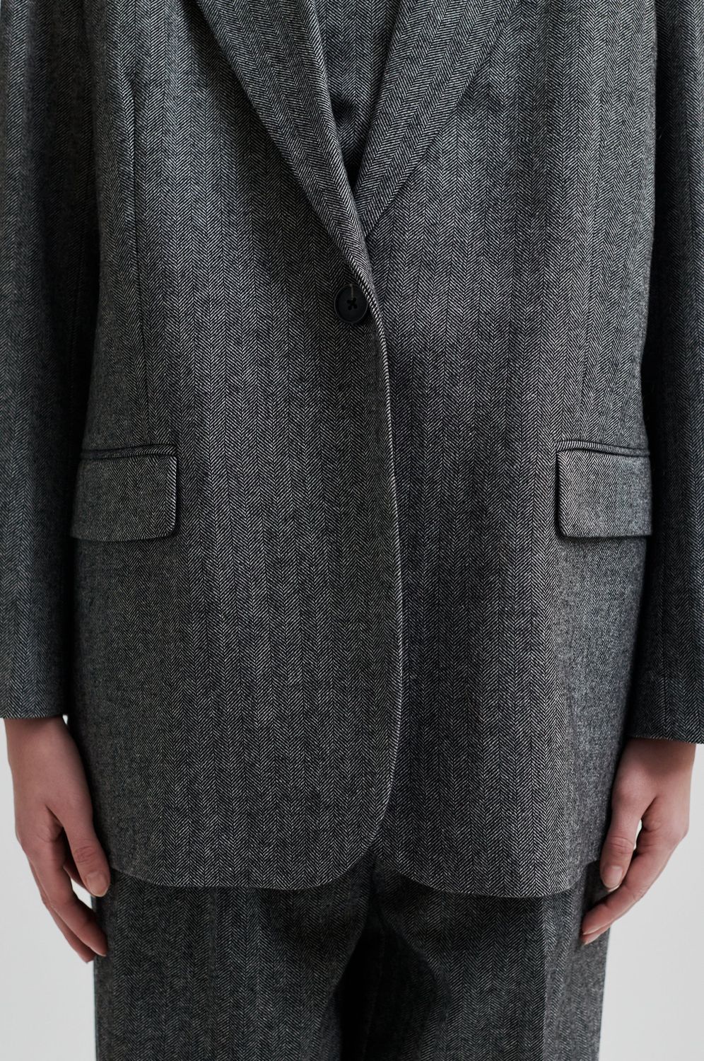 Second Female Blazer mit Fischgrätmuster. Hergestellt aus einer weichen Wollmischung. Mit breitem Revers mit Kerbe und Einknopfverschluss auf der Vorderseite. Gepolsterte Schultern und lange Ärmel mit geknöpften Manschetten. Zwei Pattentaschen. Einzelner Schlitz auf der Rückseite. Vollständig gefüttert. Lockere Passform, die eine klare und gerade Silhouette schafft.