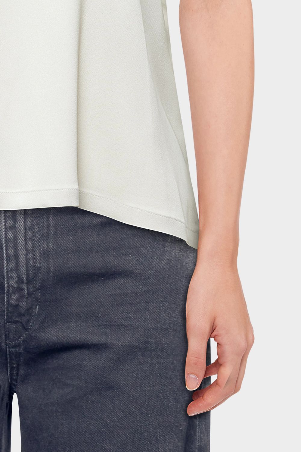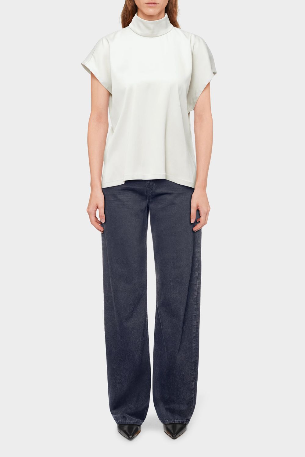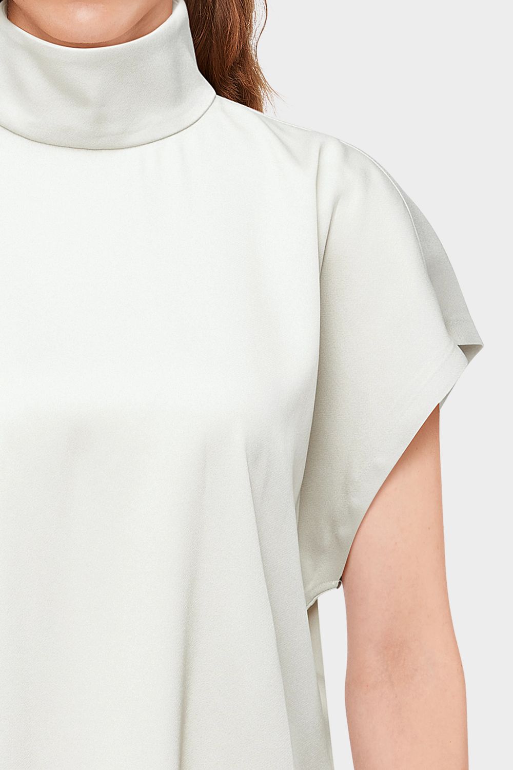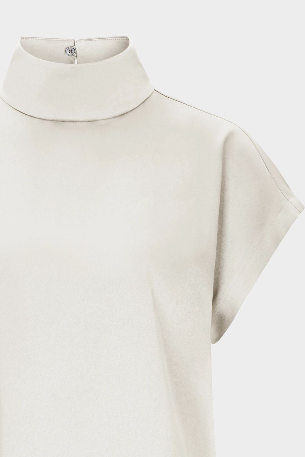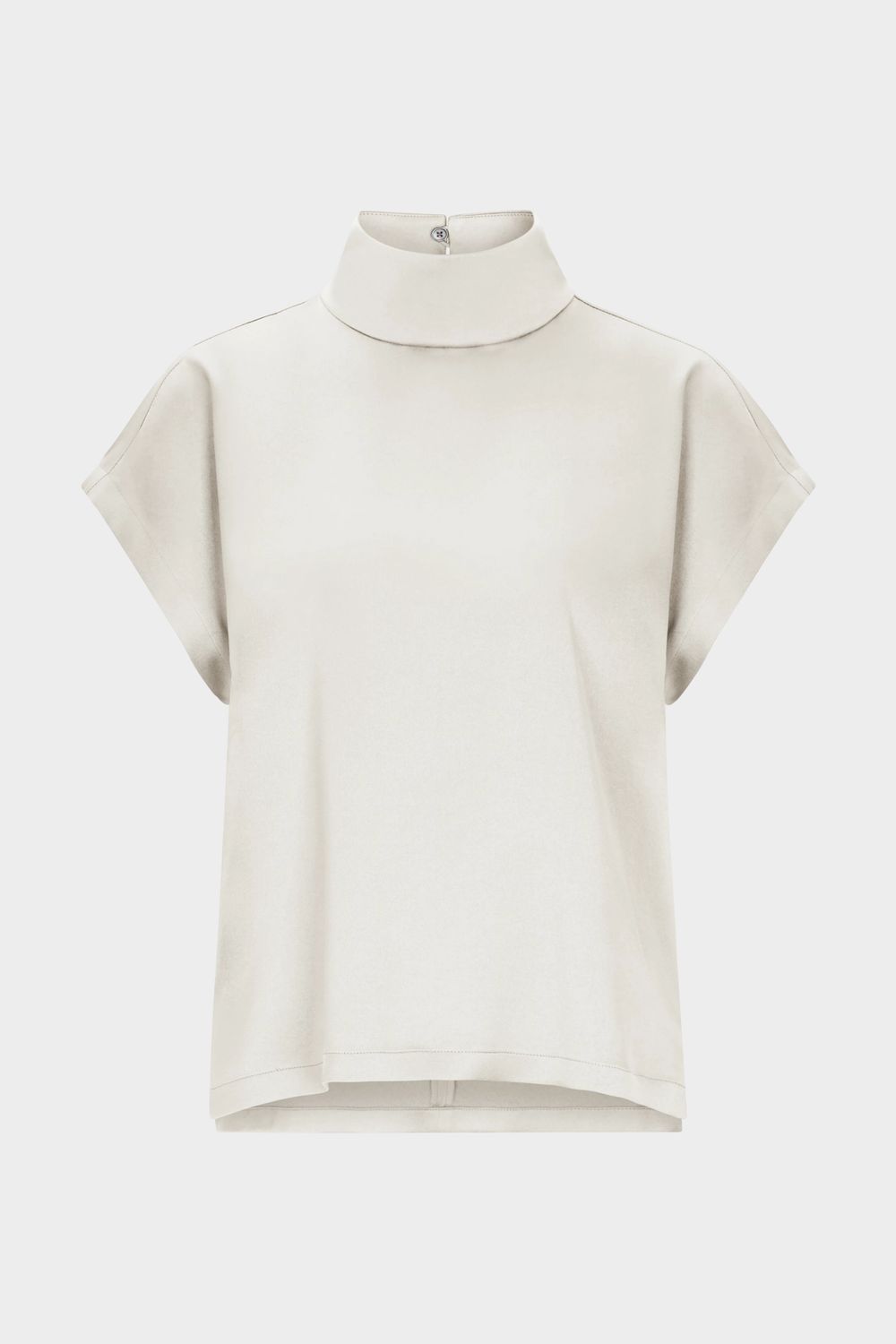 ALARIA_1 ist eine Shirt-Bluse im Relaxed Fit und H-Linie. Die Bluse hat einen kurzen überschnittenen Ärmel, einen Stehkragen und Knopfverschluss. Gefertigt aus einem hochwertigem und fließendem Satin.