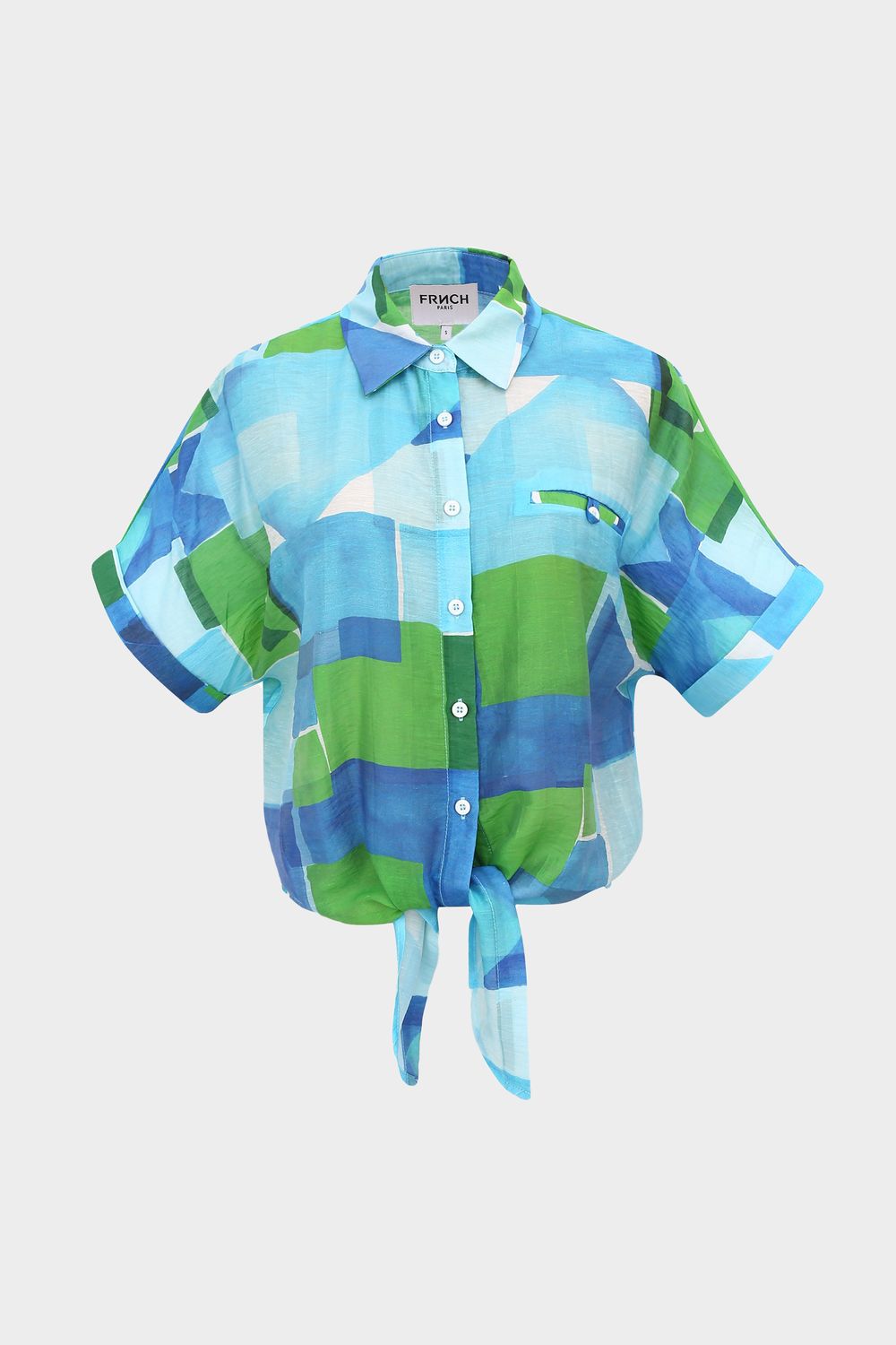 Dieses Kurzarmhemd ist eine erfrischende Wahl für ein lässiges und trendiges Outfit. Mit einem harmonischen Muster in Weiß-, Blau- und Grüntönen fängt es das Sommergefühl ein. Die kurzen Ärmel und der Hemdkragen verleihen ihm einen lässigen Touch, während die Möglichkeit, es in der Taille zu binden, eine moderne und schmeichelhafte Silhouette schafft.