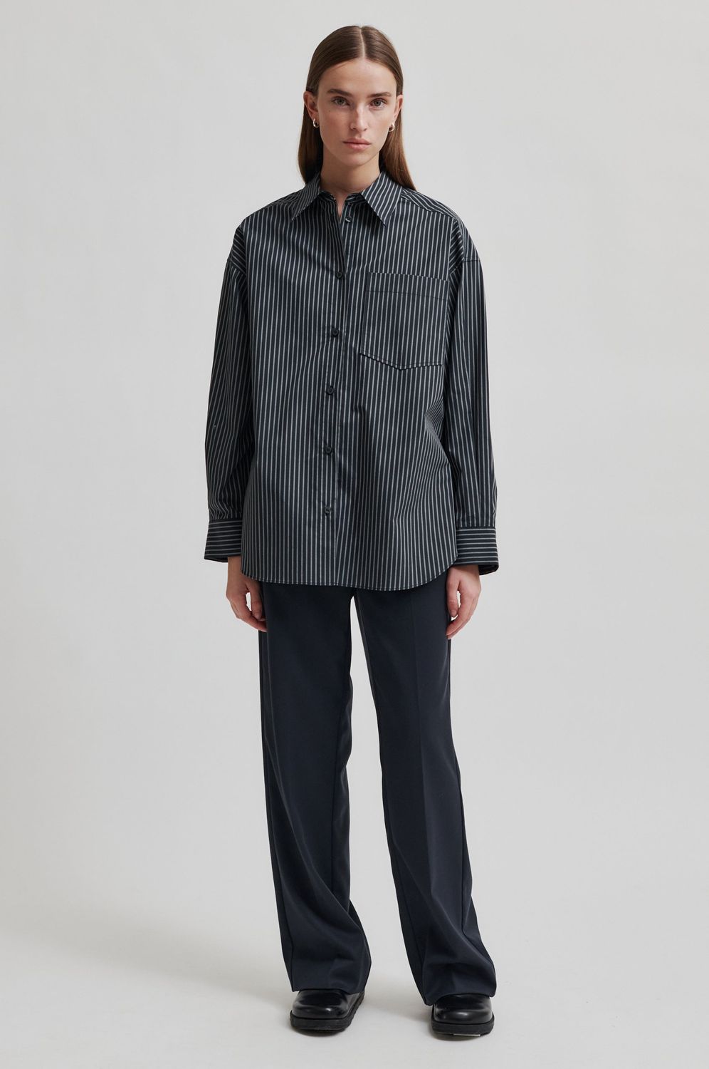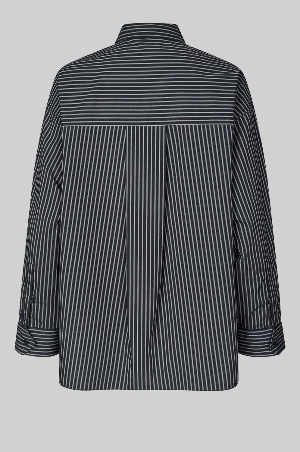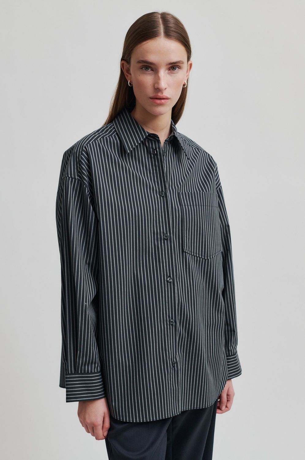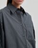 Second Female oversized gestreiftes Hemd. Gefertigt aus leichter Bio-Baumwolle mit Streifenmuster. Mit klassischem Kragen und Knopfleiste. Brusttasche auf der Vorderseite. Tief angesetzte Schultern und lange Ärmel mit Knopfmanschetten und abgeschrägten Enden. Kellerfalte an der Rückenpasse. Weite und lockere Passform.