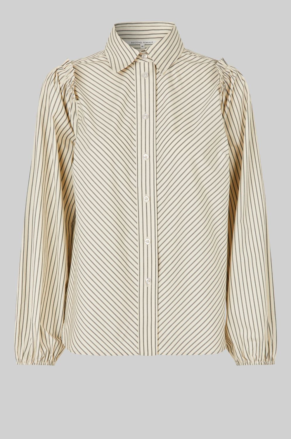 Modernes gestreiftes Hemd von Second Female. Aus leichter Bio-Baumwolle mit gestreiftem Muster. Mit regulärem Kragen und Knopfleiste mit Durchsteckverschluss. Rüschendetail an der Schulternaht und lange Ärmel mit elastischen Bündchen. Brustabnäher und kleine Raffung an der Rückenpasse. Normale Passform.