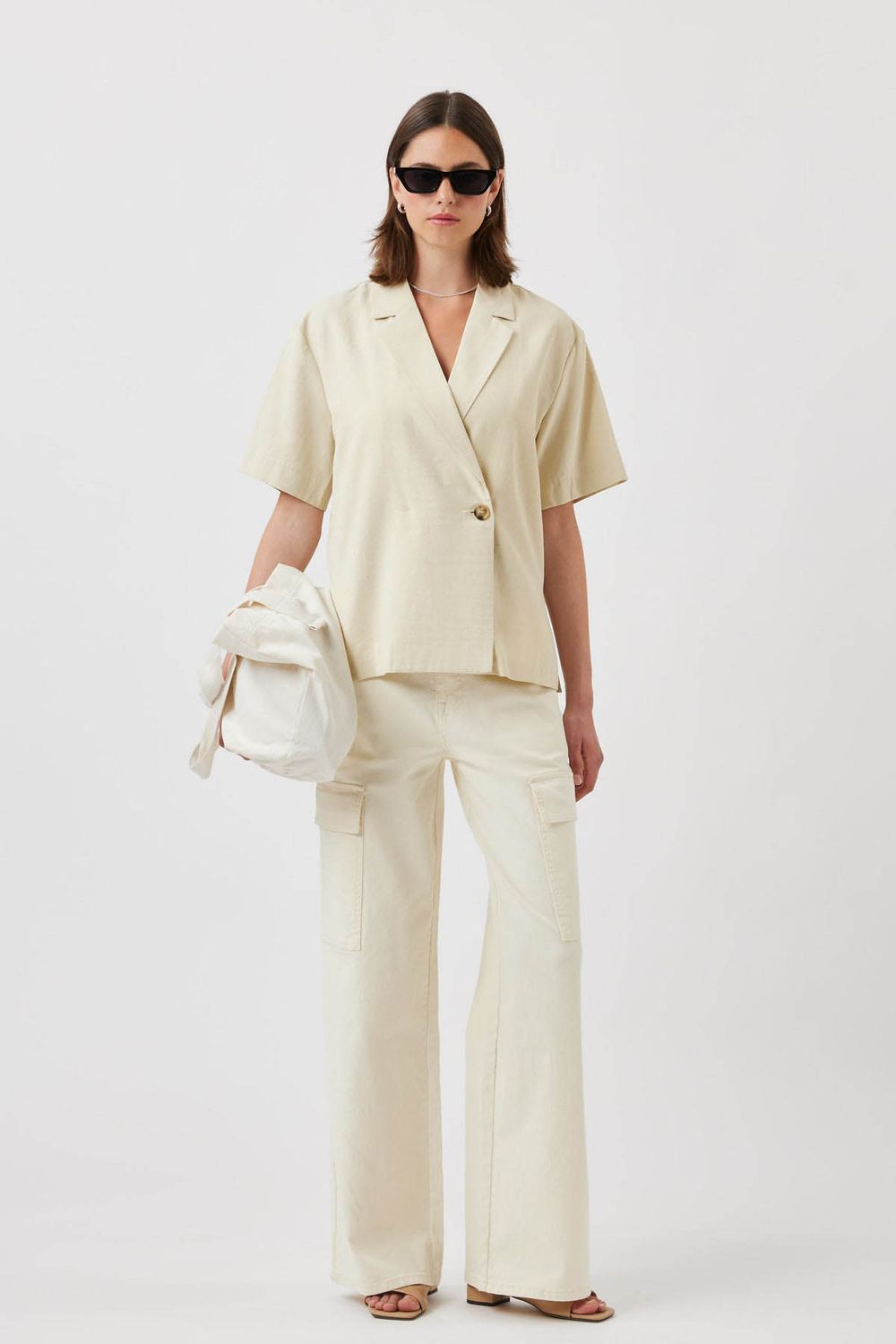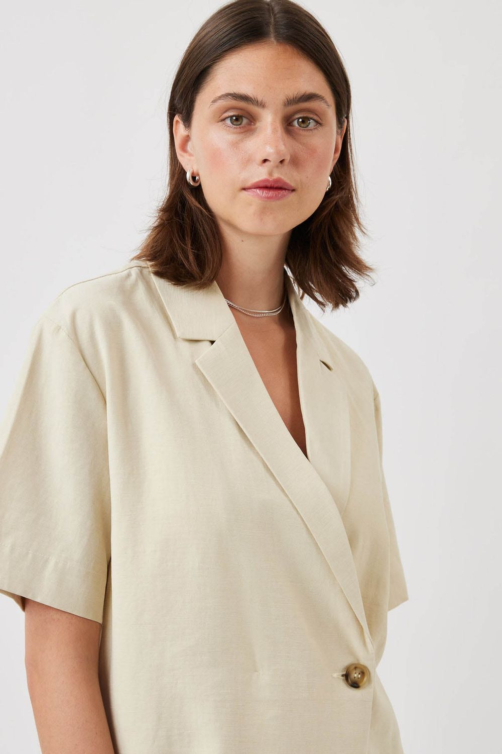 Essas ist ein trendiges kurzärmeliges Hemd aus Viskose und Polyamid. Das Hemd hat eine lockere Passform und ist mit einem Labelkragen und einem schicken Knopfverschluss ausgestattet. Das Model ist 180 cm groß und trägt Größe 36.