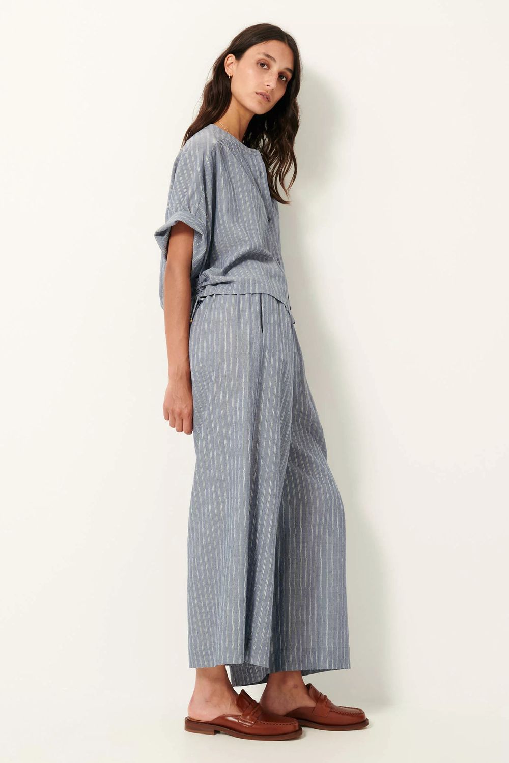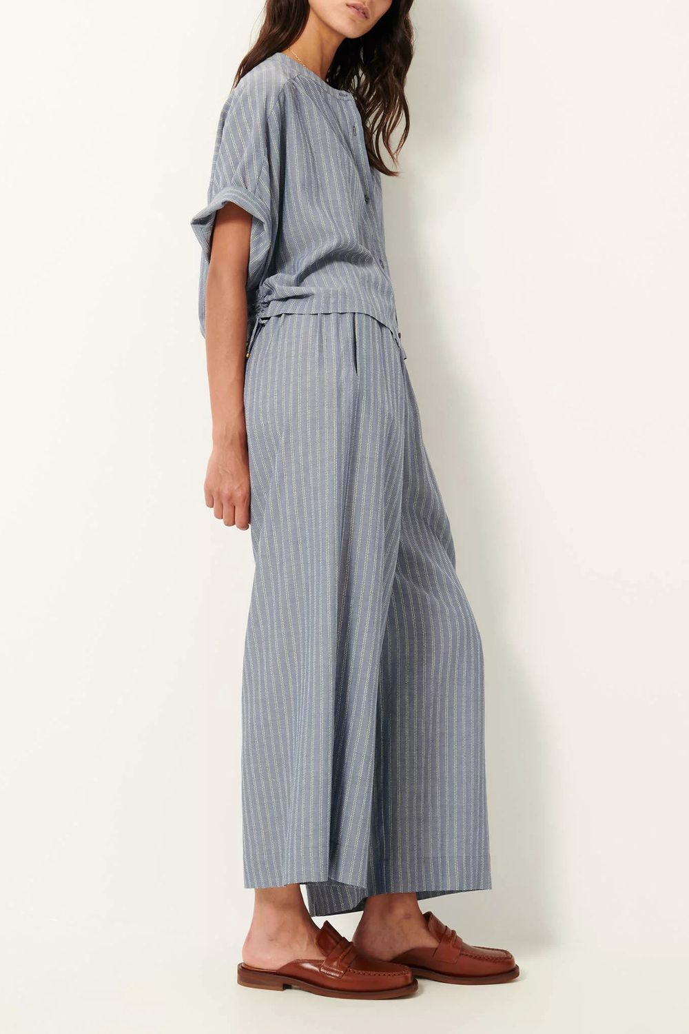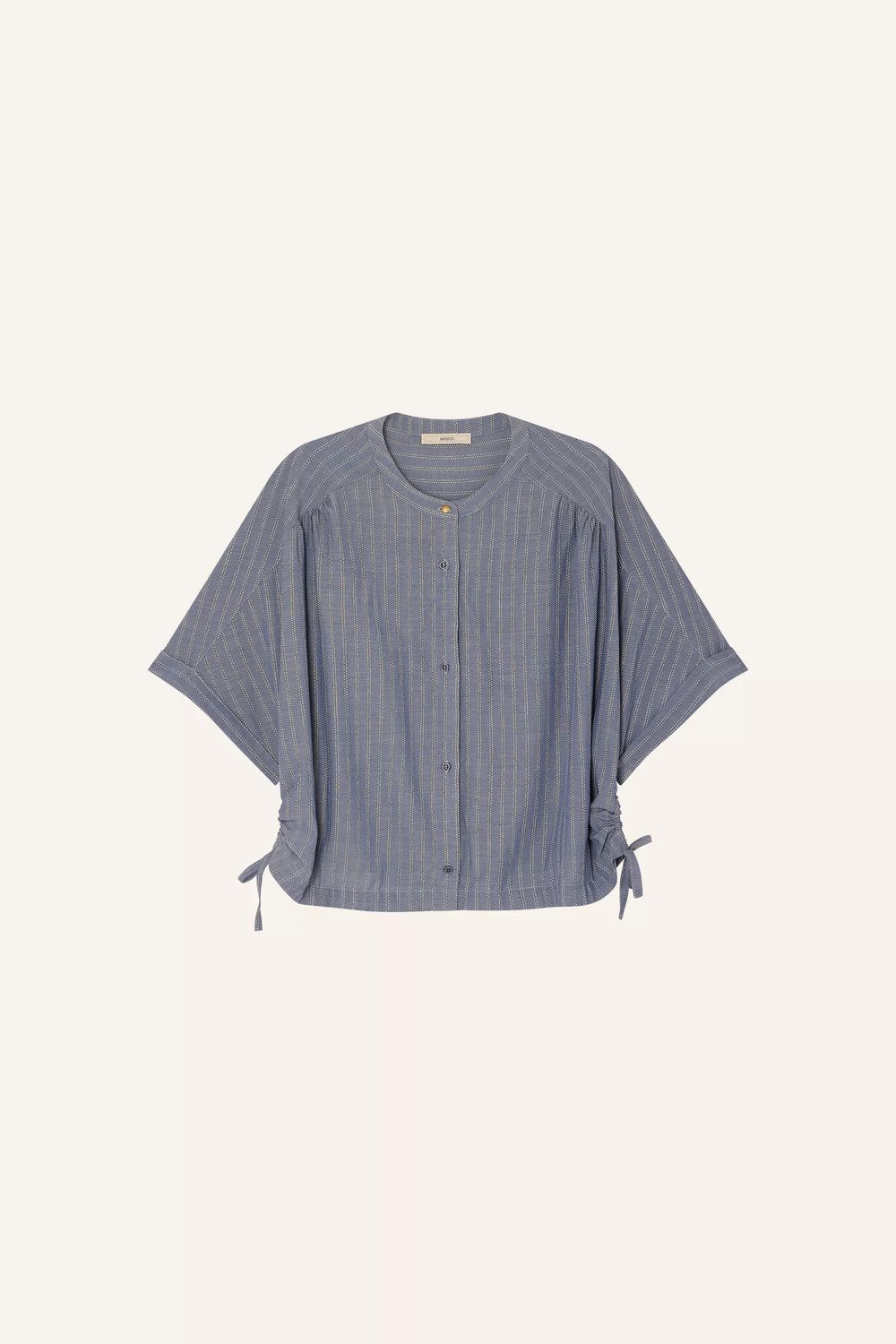 Kurze, im Rücken elastische Hemdbluse mit Bänderdetails aus weichem Chambray-Popeline mit von Steppnähten inspirierten Dobby-Streifen. Der Stoff wurde in Italien exklusiv für Sessùn gewebt.