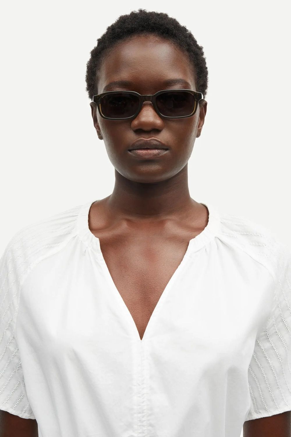Kurzärmelige Popeline-Bluse mit normaler Passform. Tunnelzug in der Taille. V-Ausschnitt. Ärmel mit Stickerei-Detail aus 100 % Baumwolle. Hauptmaterial aus 100 % Biobaumwolle.