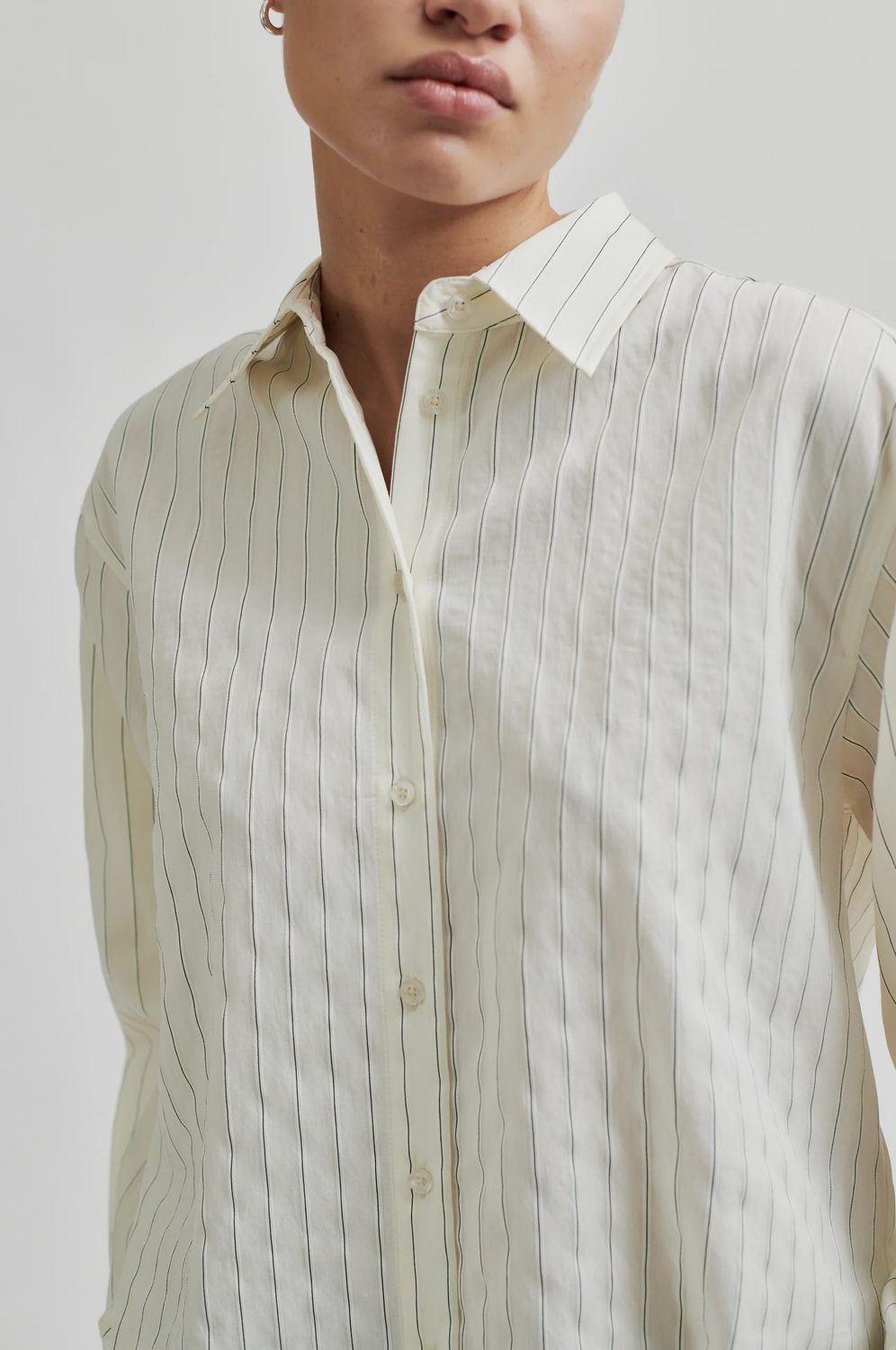 Gestreiftes Hemd in Übergröße von Second Female. Aus leichter Viskosemischung mit Allover-Streifen. Mit regulärem Kragen und durchgehender Knopfleiste. Lange Ärmel mit Knopfverschluss an den Manschetten. Kellerfalte an der Rückenpasse. Geformter Saum. Oversize-Passform.