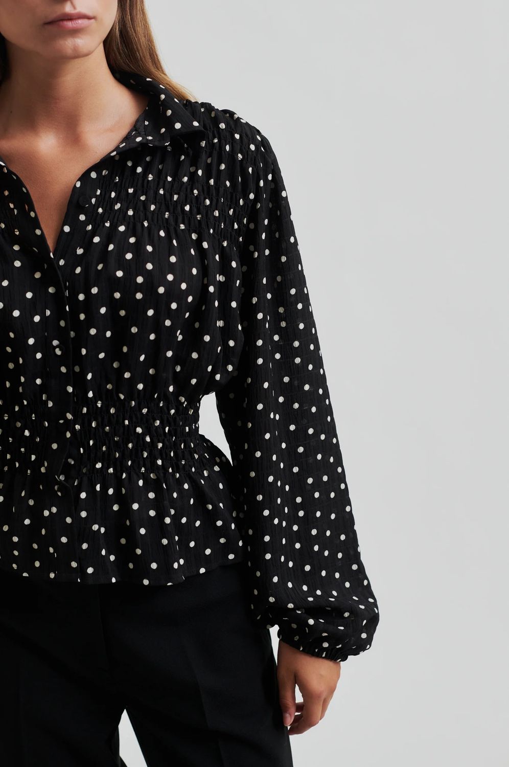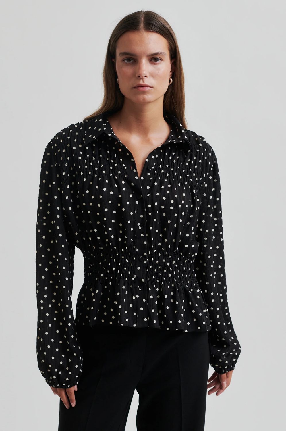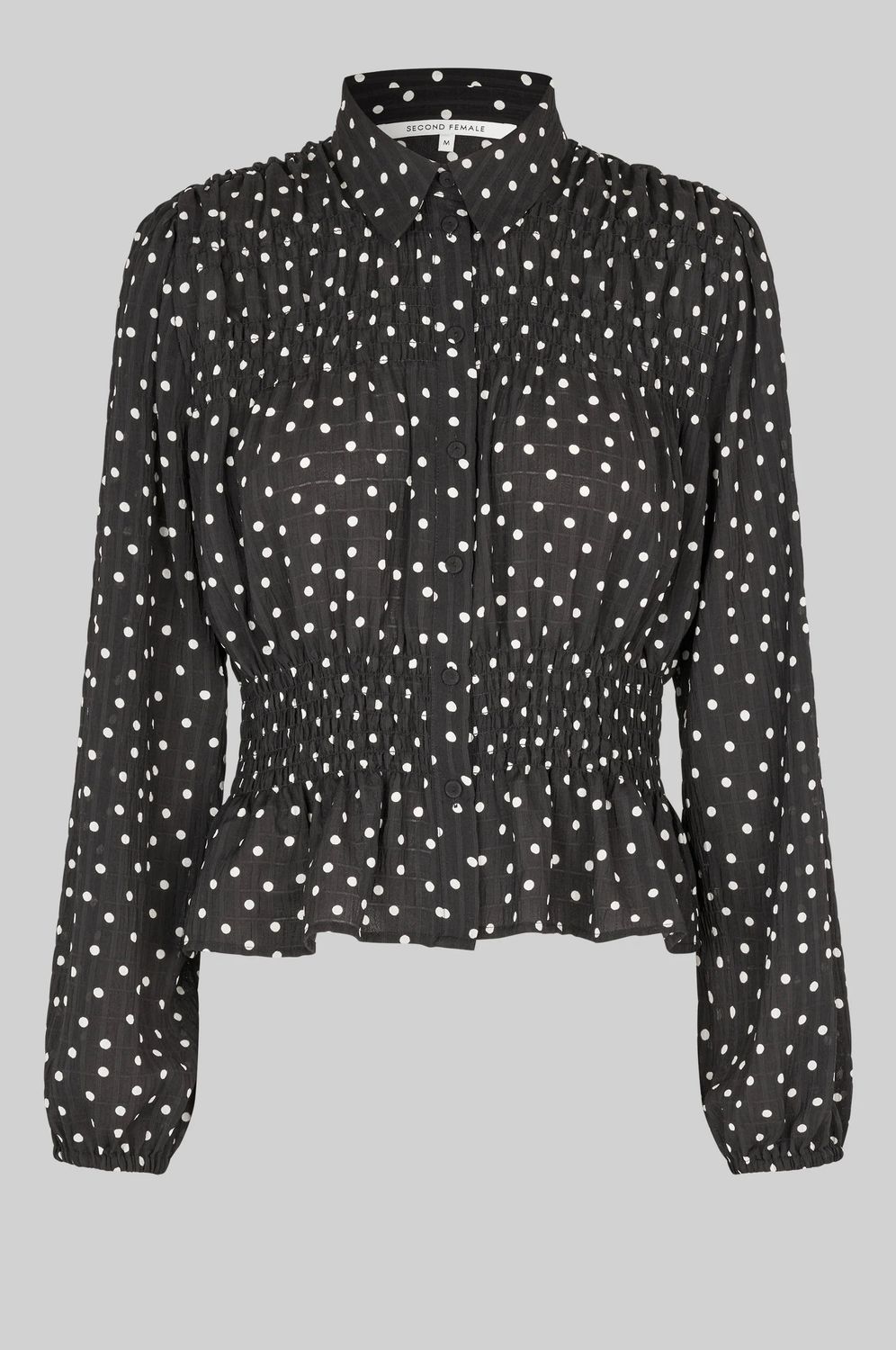 Second Female Polka-Dot-Shirt. Das Shirt ist aus leichtem, recyceltem Polyester mit leicht geknitterter Textur und durchgehendem Polka-Dot-Muster gefertigt. Mit normalem Kragen und durchgehender Knopfleiste mit verdeckten Knöpfen. Smokdetails an Brust und Taille. Lange Ärmel mit elastischen Bündchen. Normale Passform mit definierter Taille, die einen Schößchenrock-Effekt erzeugt.