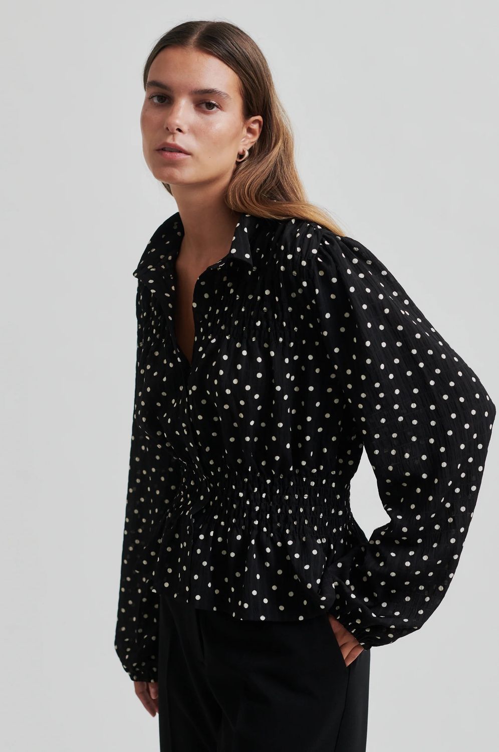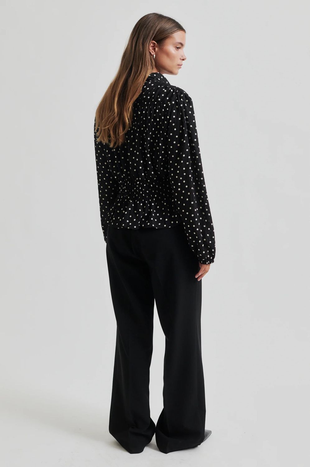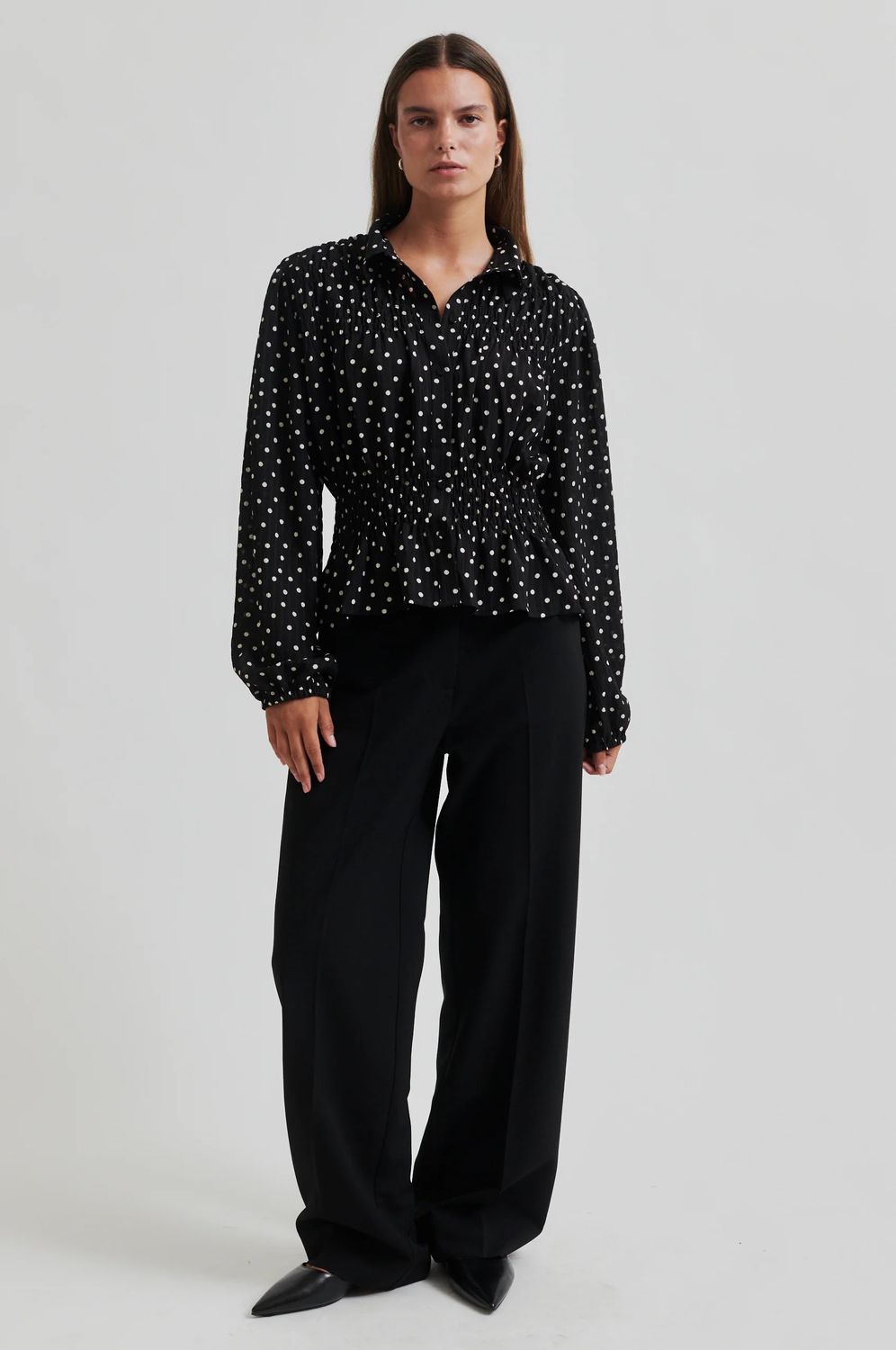 Second Female Polka-Dot-Shirt. Das Shirt ist aus leichtem, recyceltem Polyester mit leicht geknitterter Textur und durchgehendem Polka-Dot-Muster gefertigt. Mit normalem Kragen und durchgehender Knopfleiste mit verdeckten Knöpfen. Smokdetails an Brust und Taille. Lange Ärmel mit elastischen Bündchen. Normale Passform mit definierter Taille, die einen Schößchenrock-Effekt erzeugt.