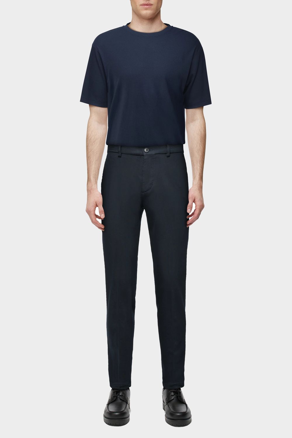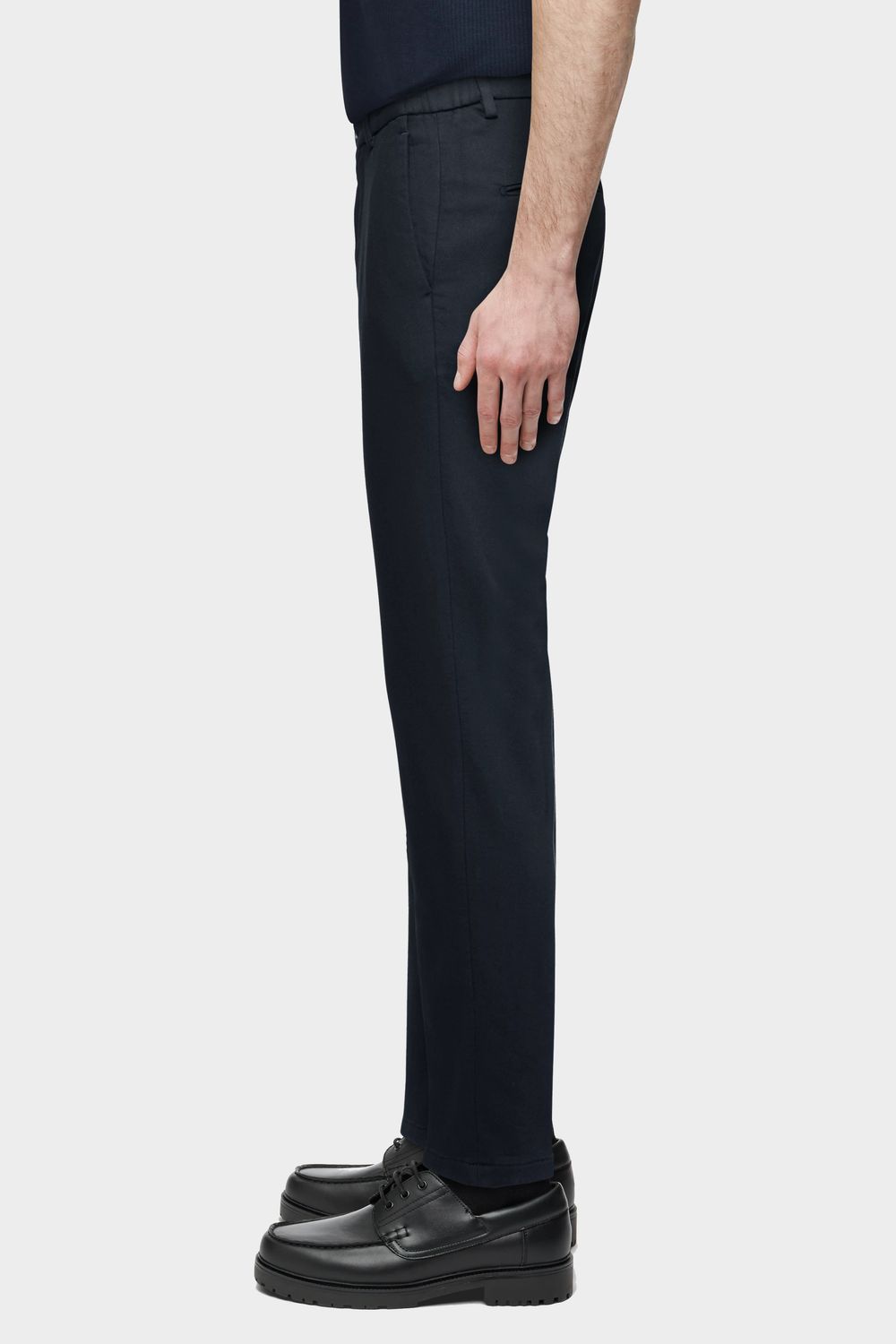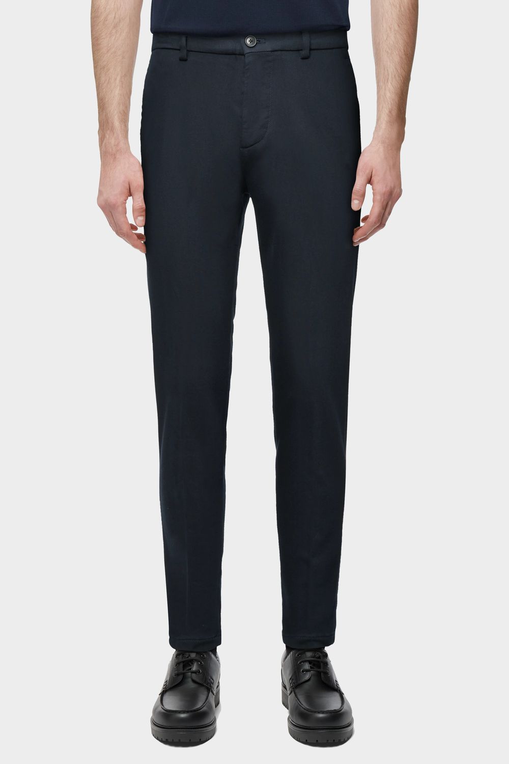 AJEND ist eine klassische Hose mit Bügelfalte und schmal zulaufendem Bein. Durch einen elastischen Einsatz seitlich am Bund bekommt sie einen sportiven Touch und bietet dadurch einen hohen Grad an Bequemlichkeit. Sie kann kombiniert werden mit einem Sakko und klassischen Schuhen für einen formellen Look. Der sportive und gewaschene Baumwolle-Viscose Jersey bietet einen angenehmen Tragekomfort.
