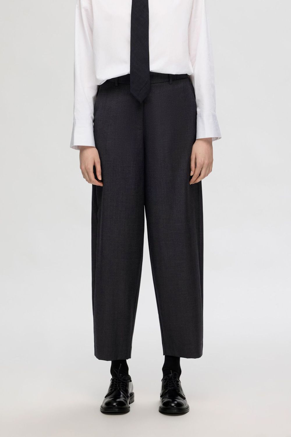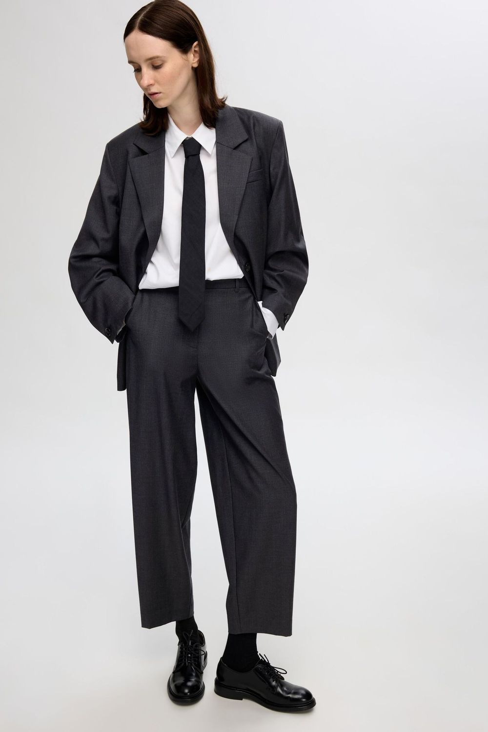 Ein hochwertiger Wollanzug ist immer eine gute Investition. Diese Anzughose hat einen markanten Barrel Fit, d. h. an den Oberschenkeln ist sie weit und bequem, bevor sie zu den Knöcheln hin schmaler wird. Das verleiht der Hose viel Volumen. Sie besteht aus 100% zertifizierter Wolle und du kannst sie mit unserem passenden Blazer, einem T-Shirt und Chunky Lederloafern zu einem modernen Tailoring-Look kombinieren.