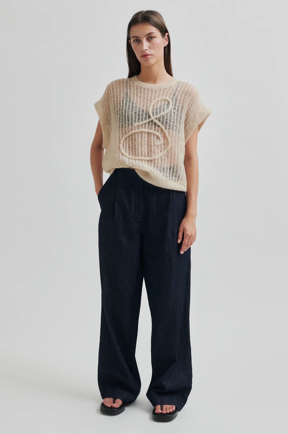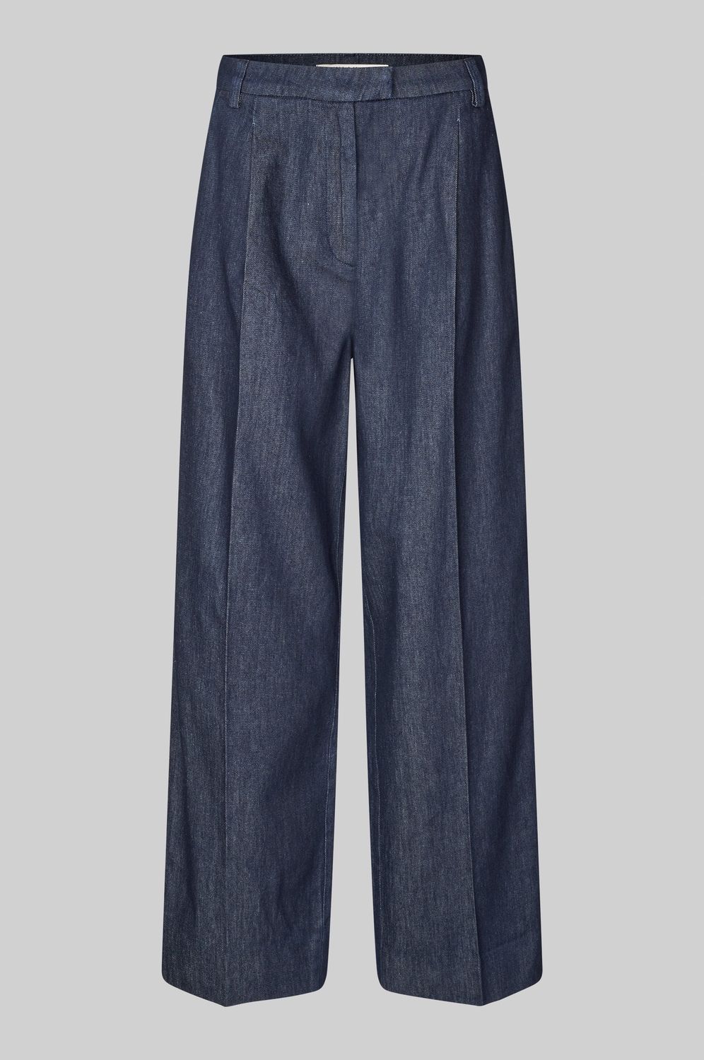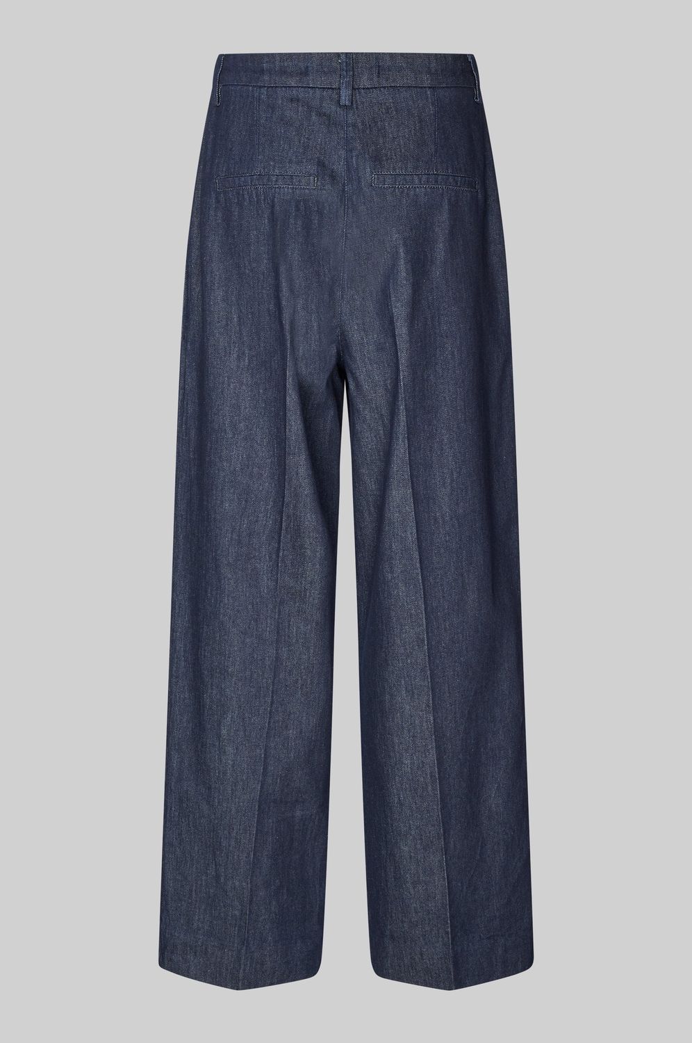 Second Female-Jeans-Bundfaltenhose. Die Hose ist aus dunkelblauem Baumwoll-Denim mit farblich abgestimmten Nähten gefertigt. Mit verdecktem Haken-, Knopf- und Reißverschluss. Falten vorne. Zwei schräge Taschen vorne und zwei dekorative Taschen hinten. Normale Bundweite mit weitem Bein.