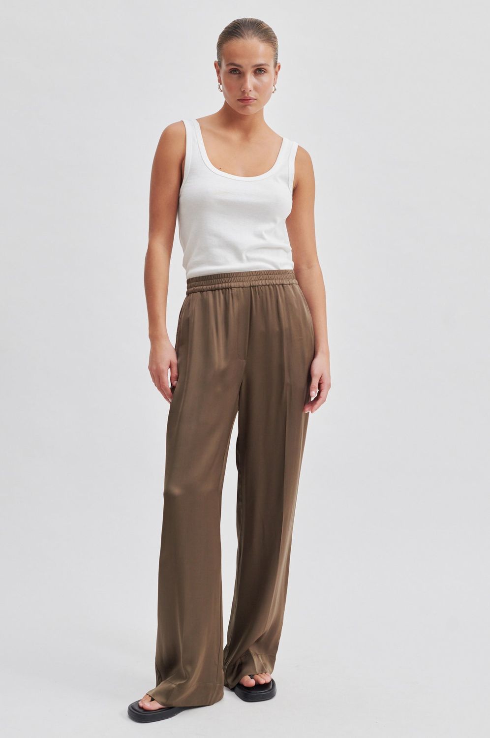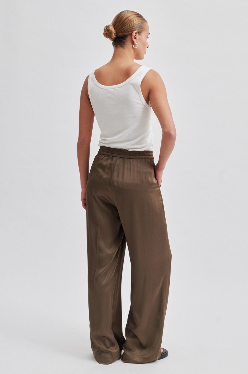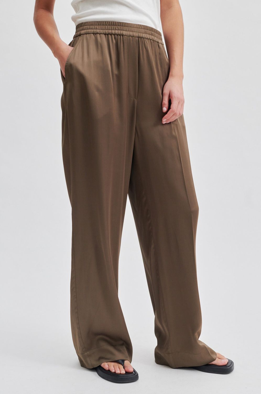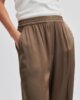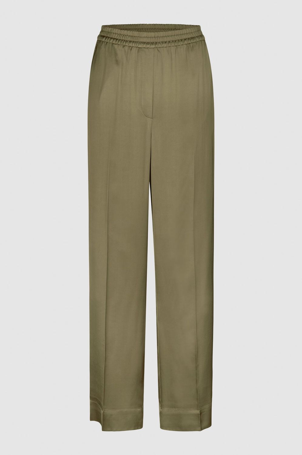 Drapierte Hose aus seidig-weicher und glatter Viskose in fließender Qualität. Mit verdecktem Gummibund. Zwei schräge Taschen auf der Vorderseite. Breiter Saum am unteren Beinende. Mittlere Taille mit weitem, geradem Bein, das eine entspannte und fließende Silhouette schafft.