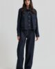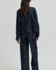 Dunkelblaue Second Female Jeans. Aus dickem Baumwolldenim mit dunkelblauer Waschung und Kontrastnähten. Verdeckter Reißverschluss mit Knopf in der Taille. Zwei schräge Taschen auf der Vorderseite und zwei Taschen auf der Rückseite. Bügelfalten an den Beinen. Glänzende silberne Beschläge. Mittelhohe Taille mit weitem, geradem Bein