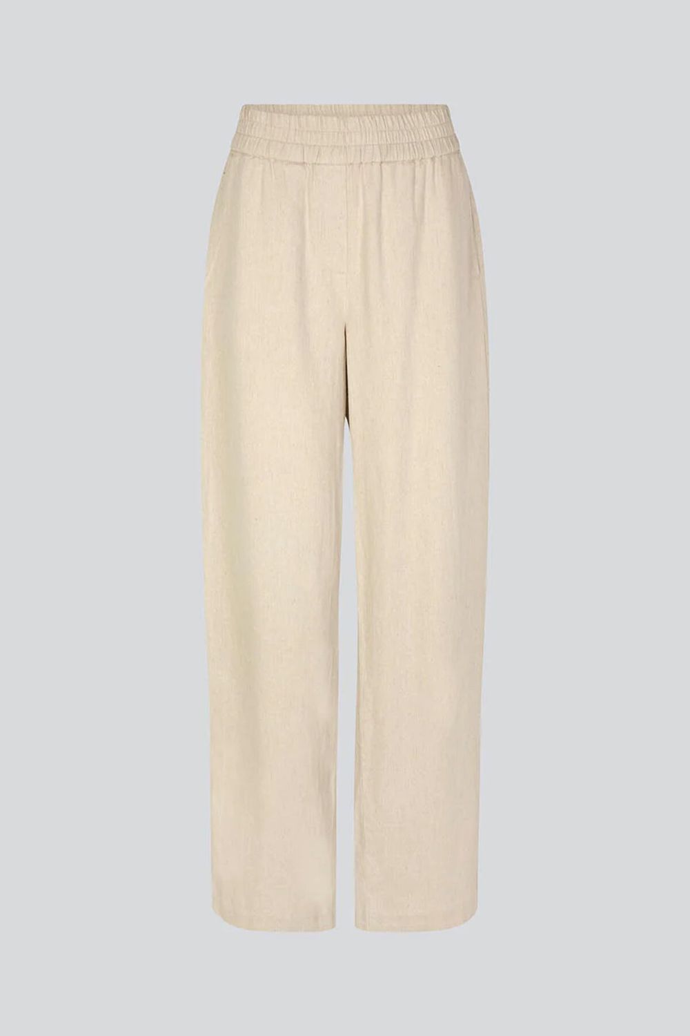 Hose in Beige mit lässigem Look und Passform aus einer Baumwoll-Leinen-Mischung. Die HonorMD Hose hat lockere Beine und eine mittlere Taille mit breitem Gummiband. Das Model ist 175 cm groß und trägt die Größe S/36.
