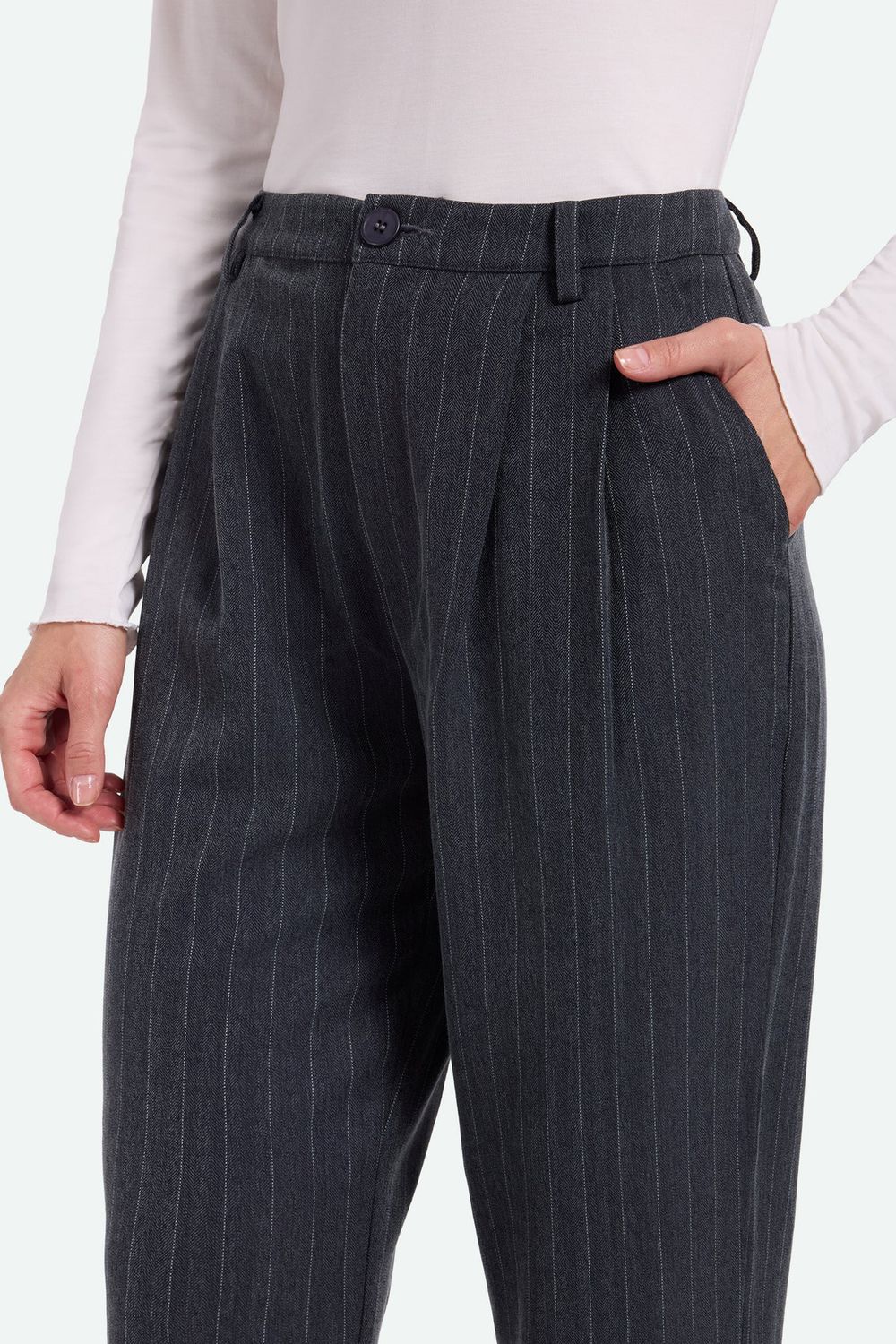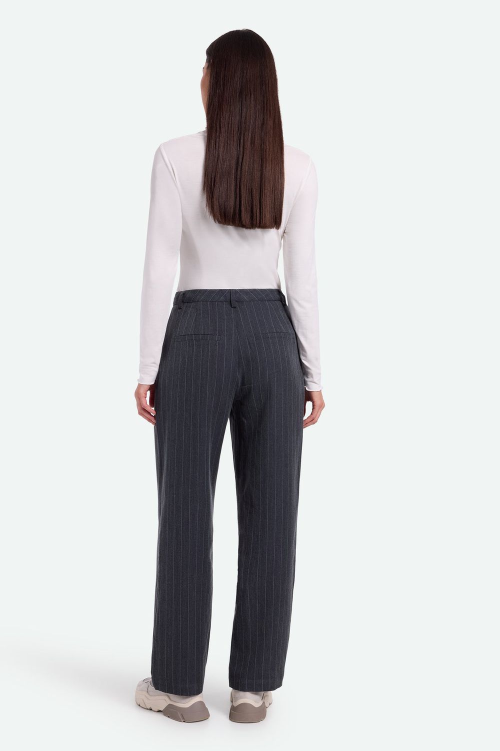 Nimma ist eine coole Chinohose aus Viskose, Polyester und Elastan für eine komfortable und dehnbare Qualität. Die Hose hat eine lockere Passform und verfügt über Knopf- und Reißverschluss, Gürtelschlaufen, Seitentaschen und Falten für einen voluminösen Look. Sie ist mit einem Nadelstreifenmuster versehen. Das Model ist 179 cm groß und trägt Größe 36.