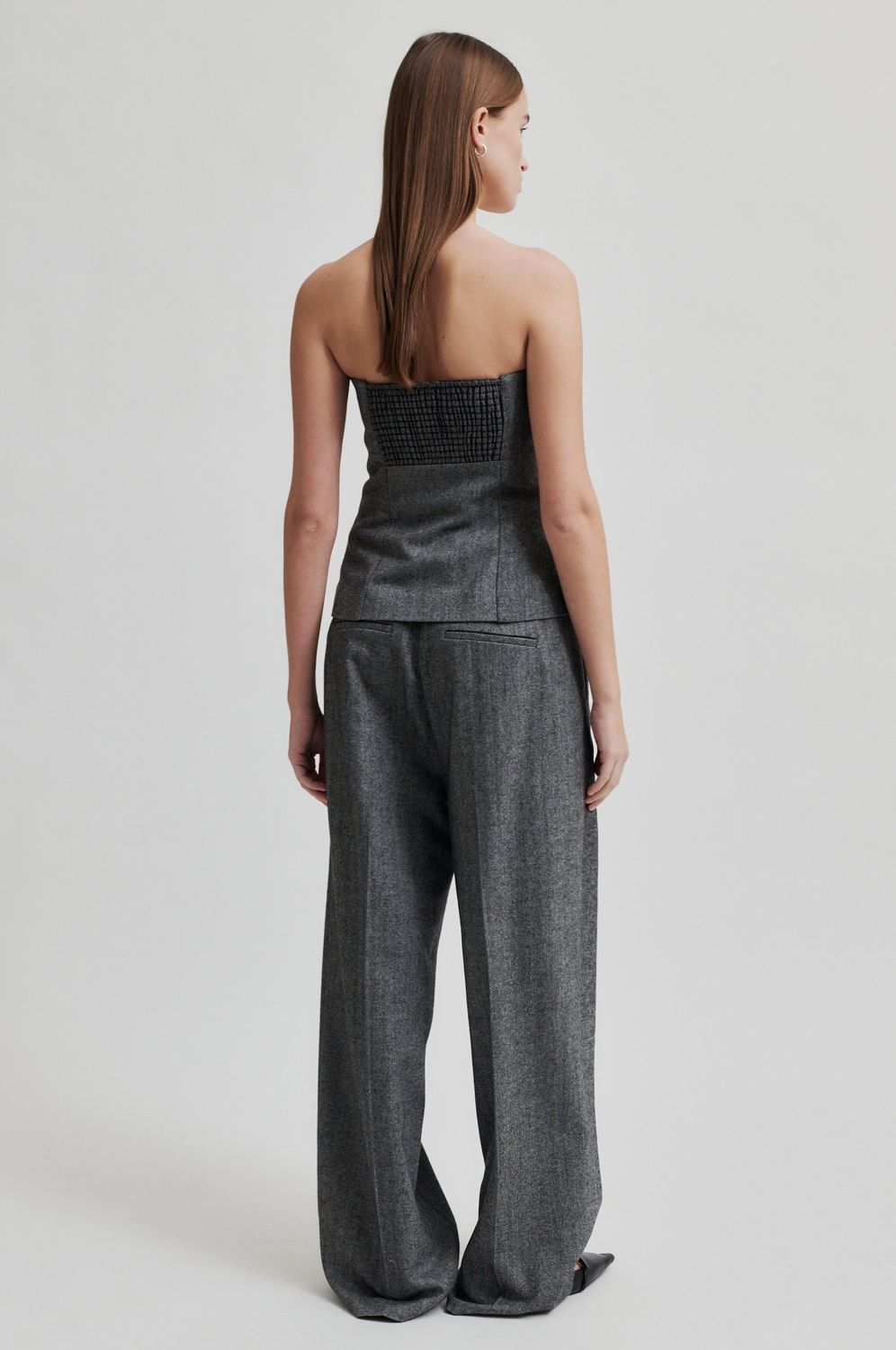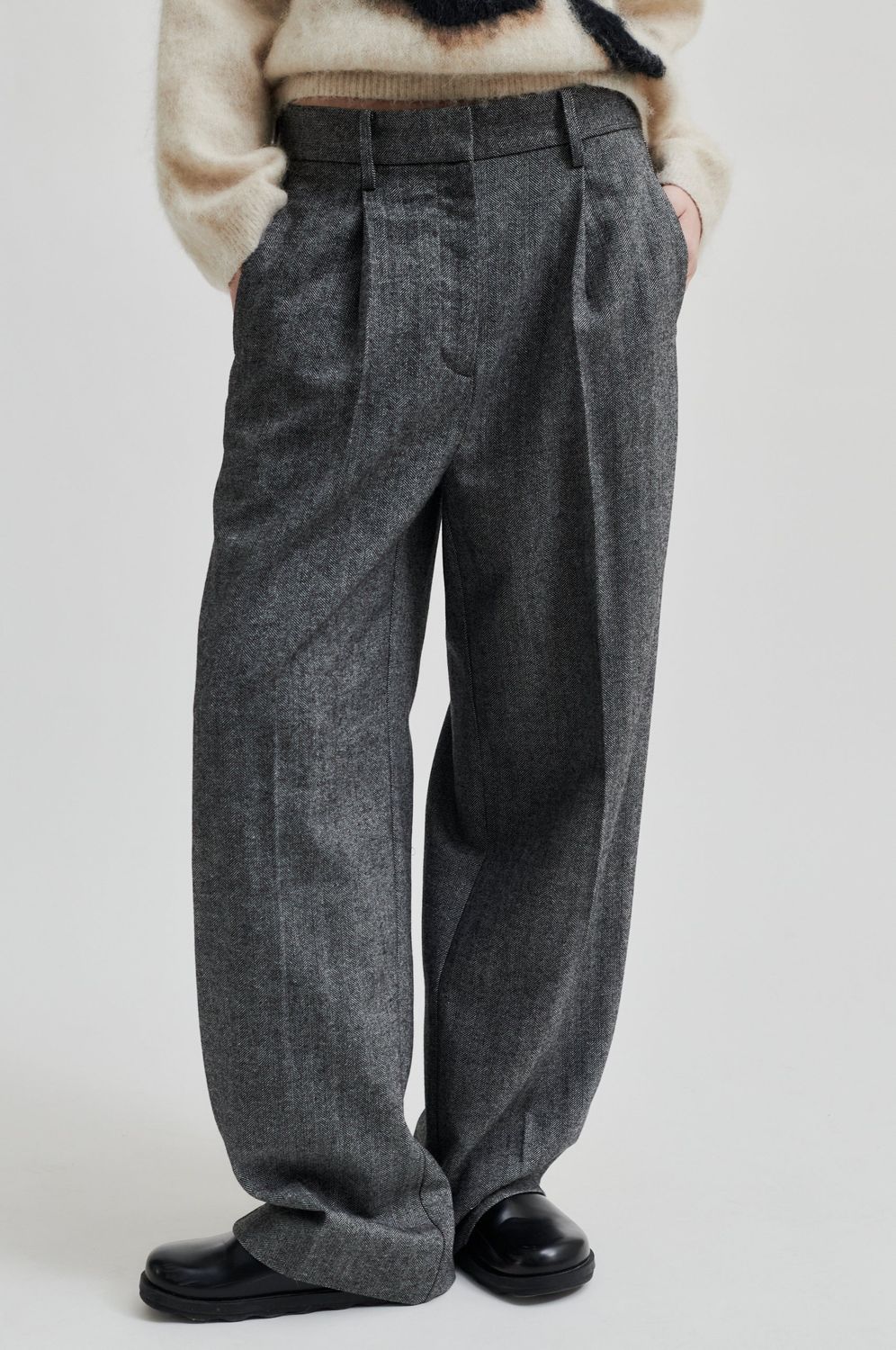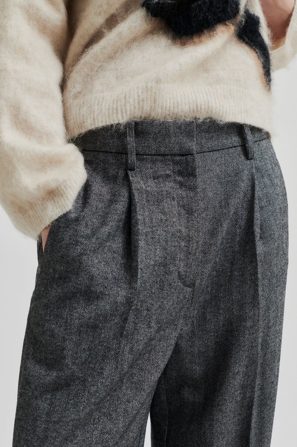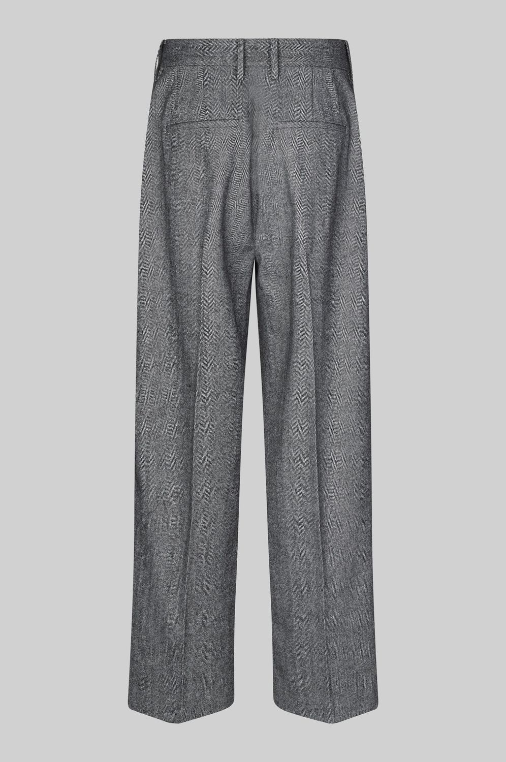 Second Female Hose mit Fischgrätmuster. Hergestellt aus einer weichen Wollmischung. Mit verdecktem Reißverschluss, Haken und Knopfverschluss. Zwei Vordertaschen und zwei Ziertaschen auf der Rückseite. Falten und Gürtelschlaufe in der Taille. Normale Taille mit extra weitem, geradem Bein.