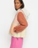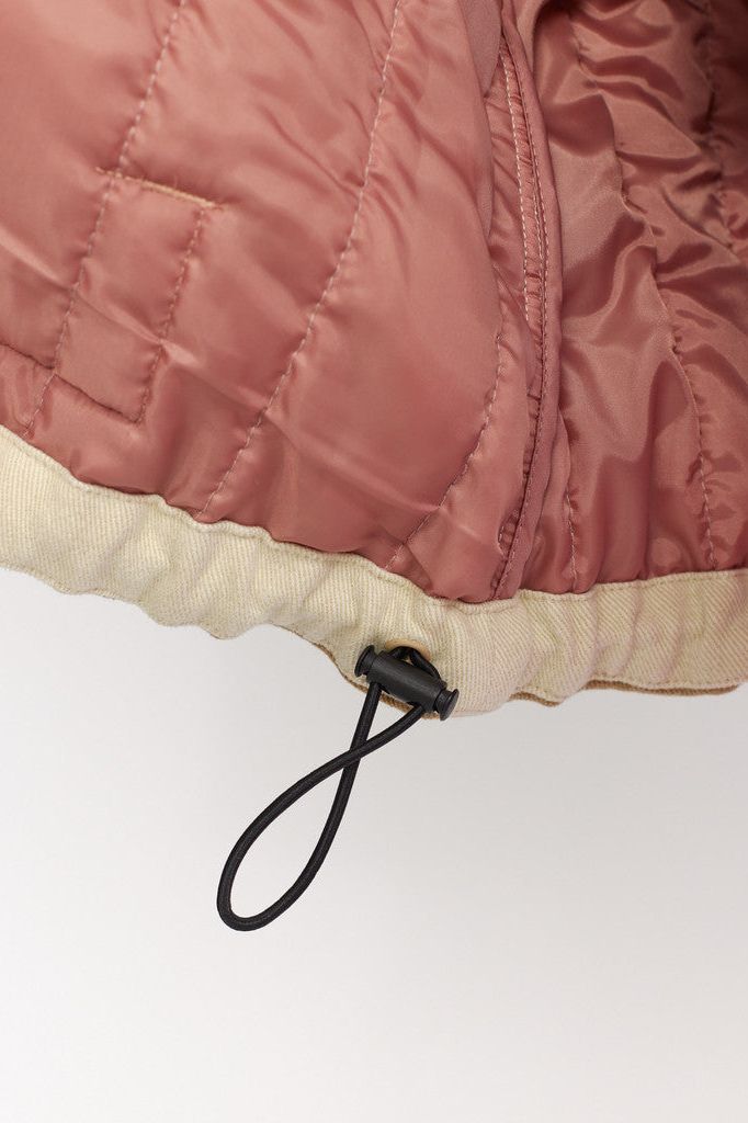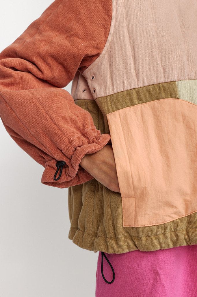 Patchwork-Steppjacke in kragenlosem Design und dezentem Oversized-Look, aus einem Baumwollstoff-Mix. Der Stoff, die Wattierung und das Futter sind mit einem vertikalen Steppmuster kombiniert, das der Jacke Elastizität verleiht. Die Jacke hat geometrische aufgesetzte Taschen, die die Form eines perfekten Halbmondes haben. Die Ärmel sind weit geschnitten, mit einem sichtbaren elastischen Kordelzug und einem Kordelstopper, der die Ärmelenden zu charakteristischen Puffärmeln bündelt. Die Jacke ist mit Recycled Thinsulate™-Isolierung gepolstert, die für ein schlankes Design sorgt, ohne dass die Wärmeleistung darunter leidet. Diese Wattierung besteht zu 78 % aus recycelten Fasern, schließt mehr Luft auf kleinerem Raum ein und hält Sie überraschend warm.