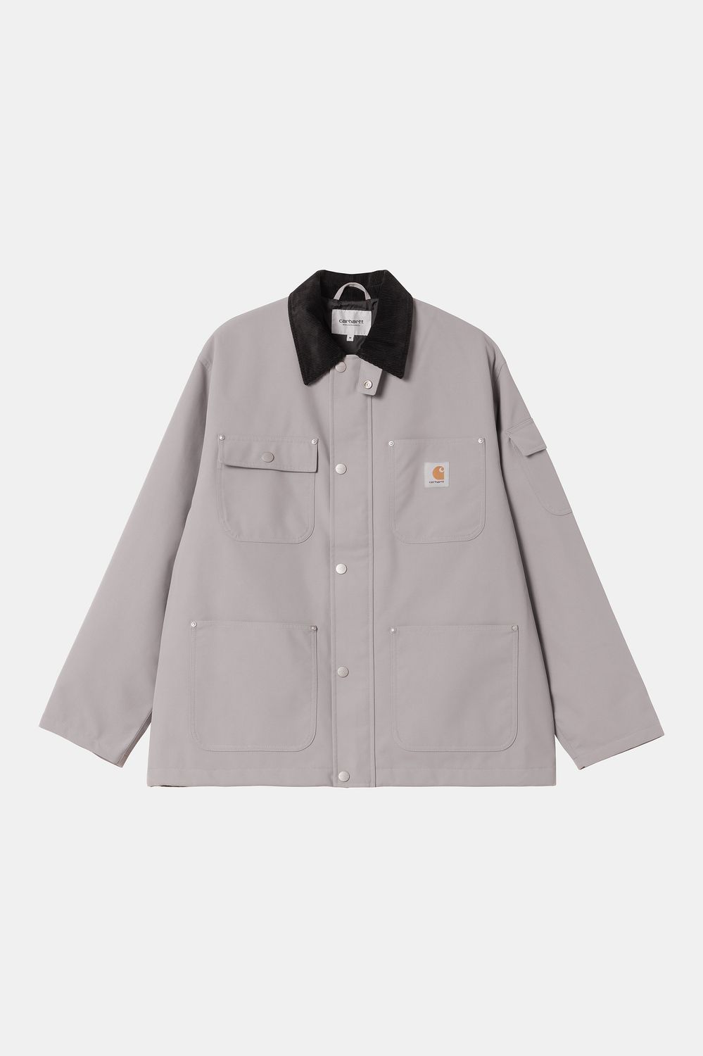 Die Clapton Jacket ist vollständig gefüttert und besteht aus einem mittelschweren Nylon-Canvas. Sie ist mit einem Kordkragen ausgestattet, der zusätzlich mit einem Riemen mit Druckknopf geschlossen werden kann. Die Jacke wird mit einem Zwei-Wege-Reißverschluss und Druckknöpfen geschlossen, während die Manschetten und der Saum verstellt werden können. Auf der Vorderseite befinden sich vier Taschen, auf einem Ärmel ist außerdem eine Tasche mit Metallnieten angebracht. Eine der Brusttaschen ist mit einem gewebten Square Label versehen.