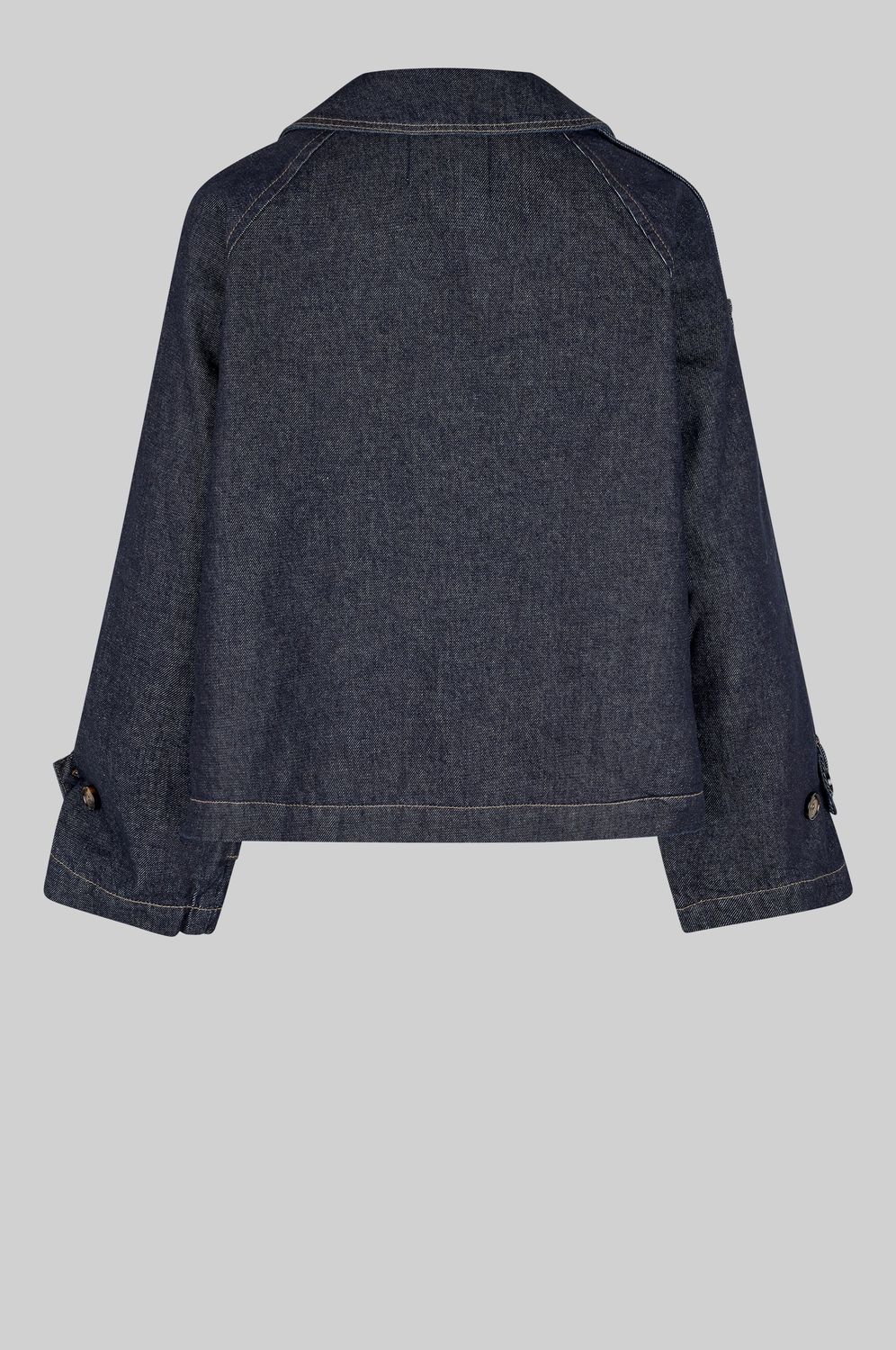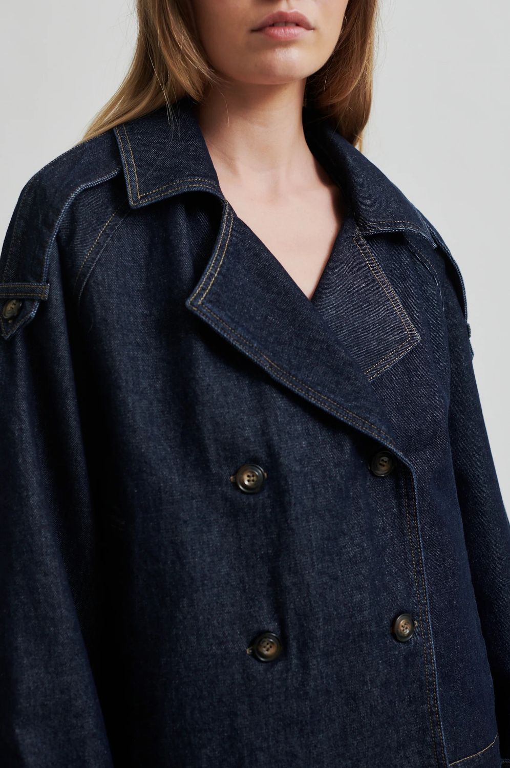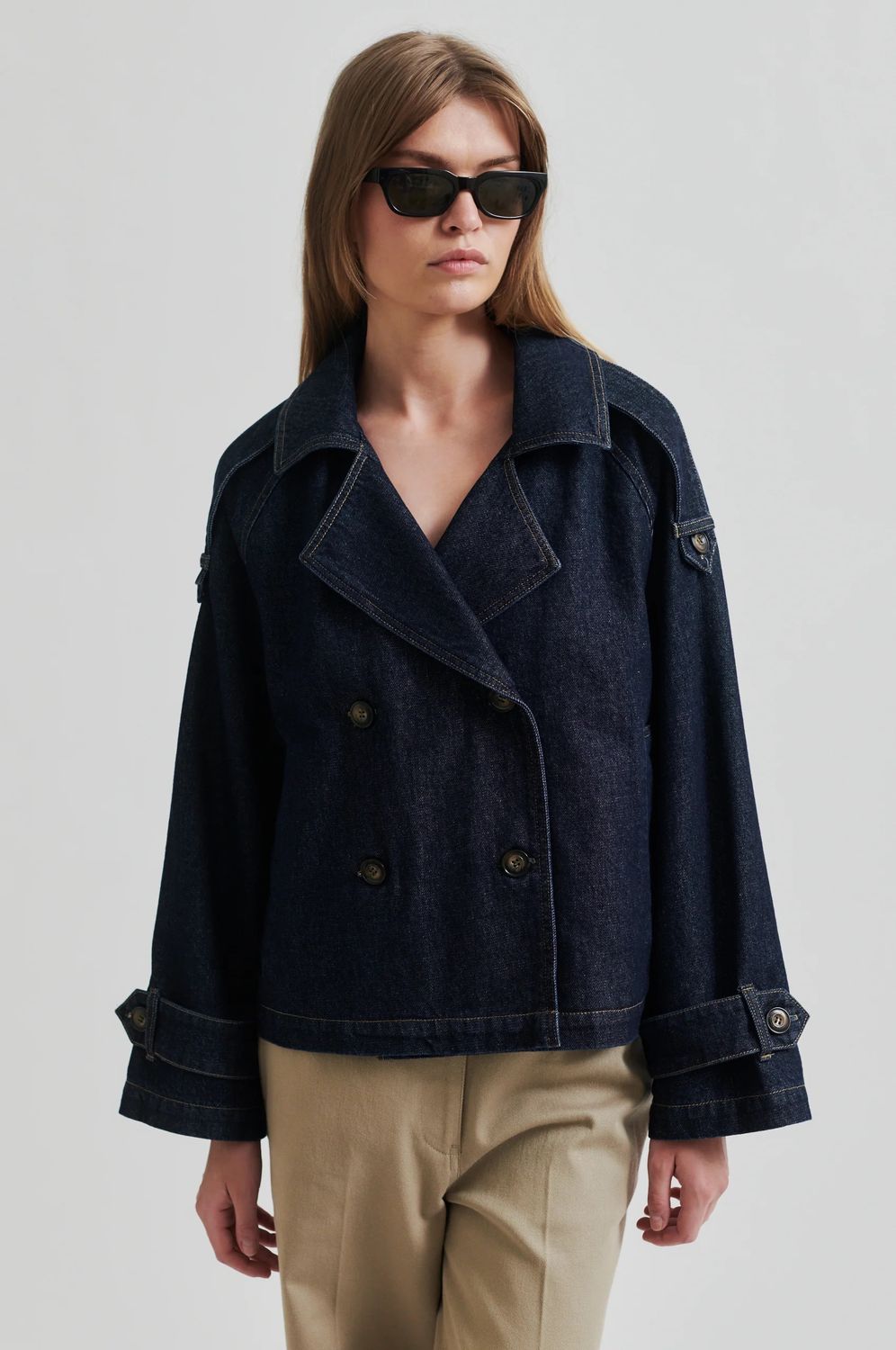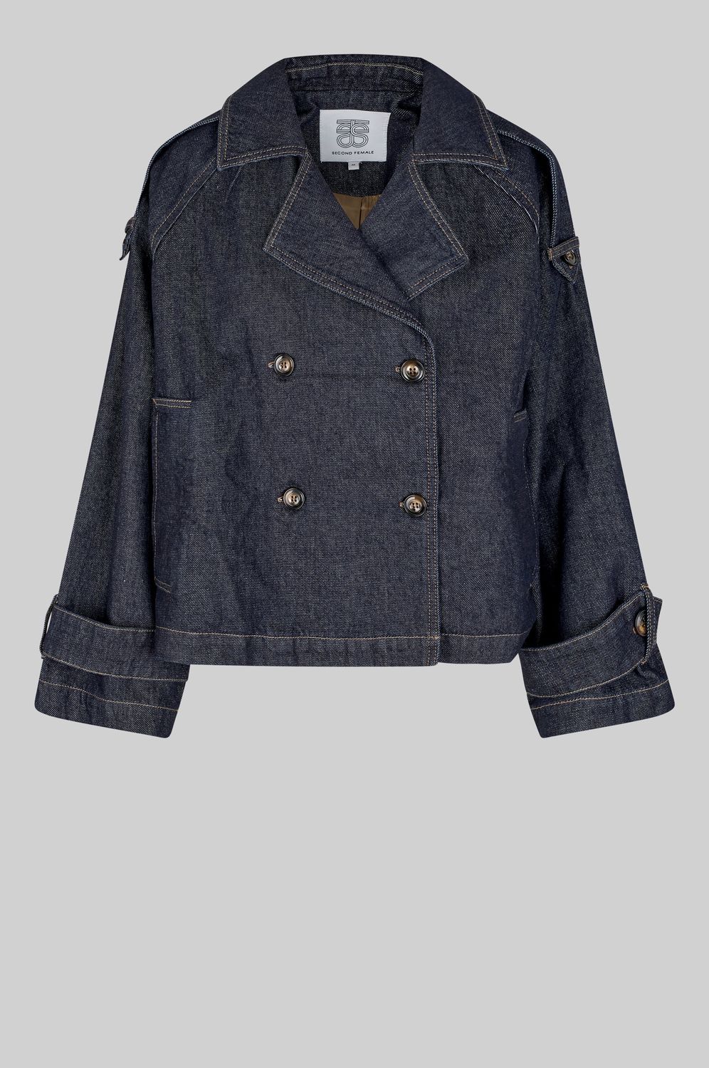 Second Female Jeansjacke aus Baumwoll-Denim mit dunkelblauer Waschung und Kontrastnähten. Mit breitem Reverskragen, zweireihigem Verschluss vorne und Trägern mit Knöpfen an den Schultern. Raglanärmel mit verstellbaren Trägern an den Manschetten. Lockere Passform mit gerader, leicht kastenförmiger Silhouette.
