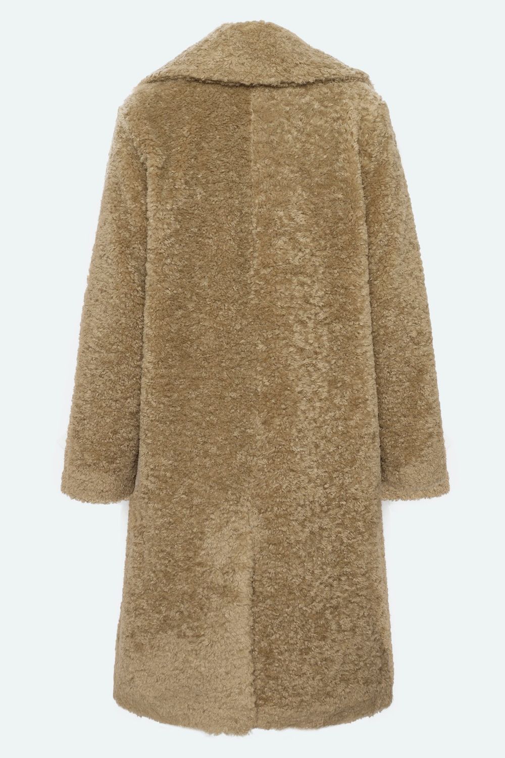 Emina ist eine mittellange Teddyjacke aus 100% Polyester für eine flauschige und weiche Qualität. Die Teddyjacke hat eine lockere Passform und ist mit einem tiefen Reverskragen, Knopfverschluss und zwei Seitentaschen ausgestattet. Das Model ist 179 cm groß und trägt Größe 36.