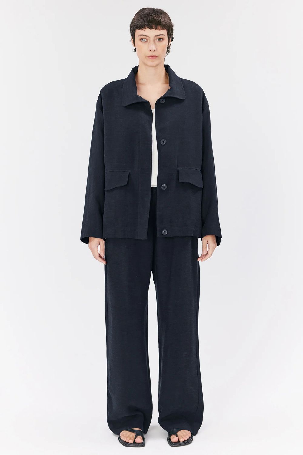 Majlis ist eine Jacke aus veredeltem Cly/Li-Gewebe, die sich an Gebrauchsgegenständen orientiert. Das Material kombiniert die weichen und nachhaltigen Eigenschaften von Lyocell mit der zeitlosen Anziehungskraft von Leinen und schafft so eine luftige und leichte Sommerjacke. Zu den Details gehören ein Knopfverschluss, ein verdeckter, verstellbarer Saum, ein Kragen, der auf- oder umgeklappt getragen werden kann, und eine EE-Symbol-Stickerei.