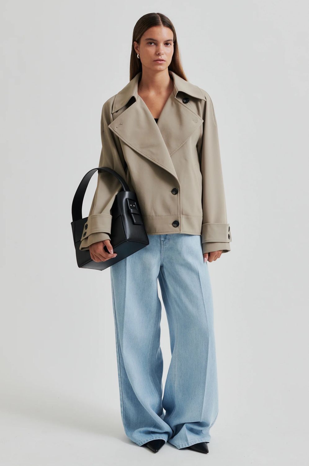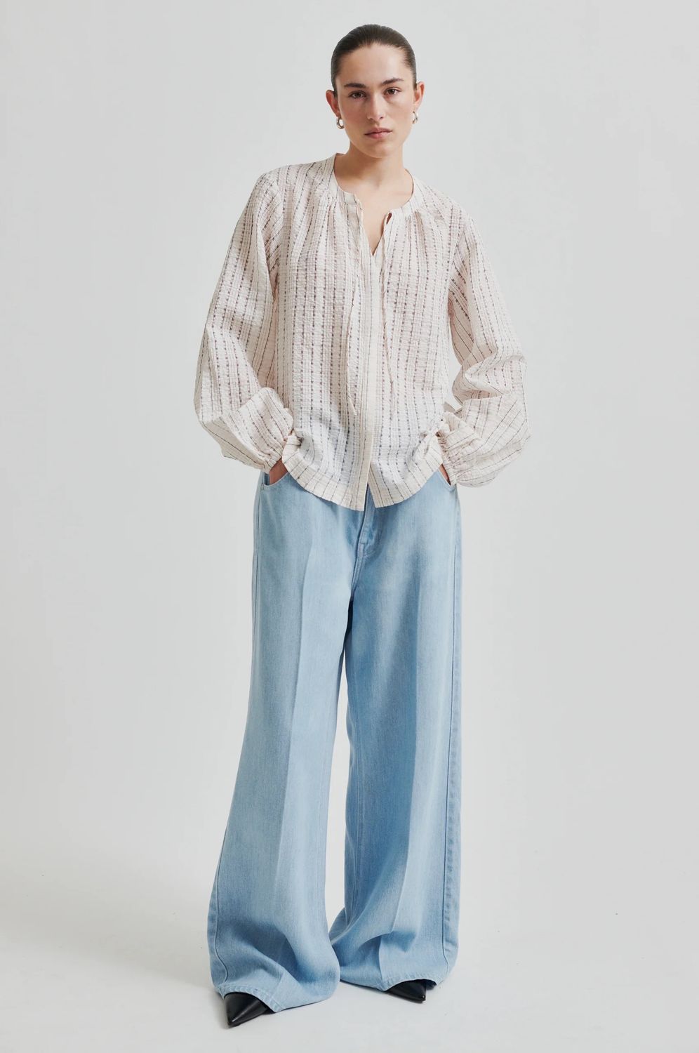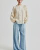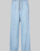 Second Female hellblaue Damenjeans aus Denim. Die Jeans ist aus weichem und fließendem Lyocell-Denim mit farblich abgestimmten Nähten gefertigt. Mit verdecktem Reißverschluss und Knopfverschluss am Bund. Stoffgürtel in der Taille. Fünf-Taschen-Stil. Mittlere Taille und lockere Passform mit extra weitem Bein.