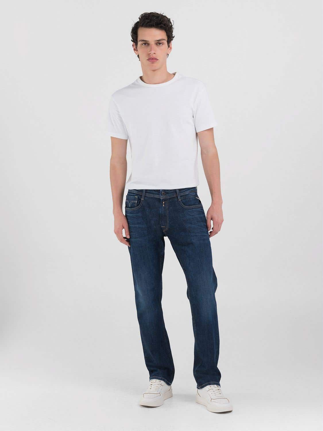 Jeans im Comfort Fit mit normaler Taille und geradem Bein in bequemer, entspannter Passform. Das zeitgemäße Modell ist aus tief indigoblauem 10,5-oz-Stretch-Denim aus Bio-Baumwolle mit einer umweltfreundlichen Rinsed-Waschung mit Rough-Effekt gefertigt. Diese Five-Pocket-Jeans für Herren zeichnet sich durch Moustaches, Schleifspuren und Abriebstellen aus, die an den Verschleißstellen Farbkontraste auf dem Denim erzeugen. Die Gesäßtaschen und die fünfte Tasche zeichnen sich durch die ikonische geschwungene Naht aus, während eine der Gesäßtaschen mit einer R-Stickerei verziert ist. Verschluss mit Knopf und Reißverschluss.
