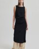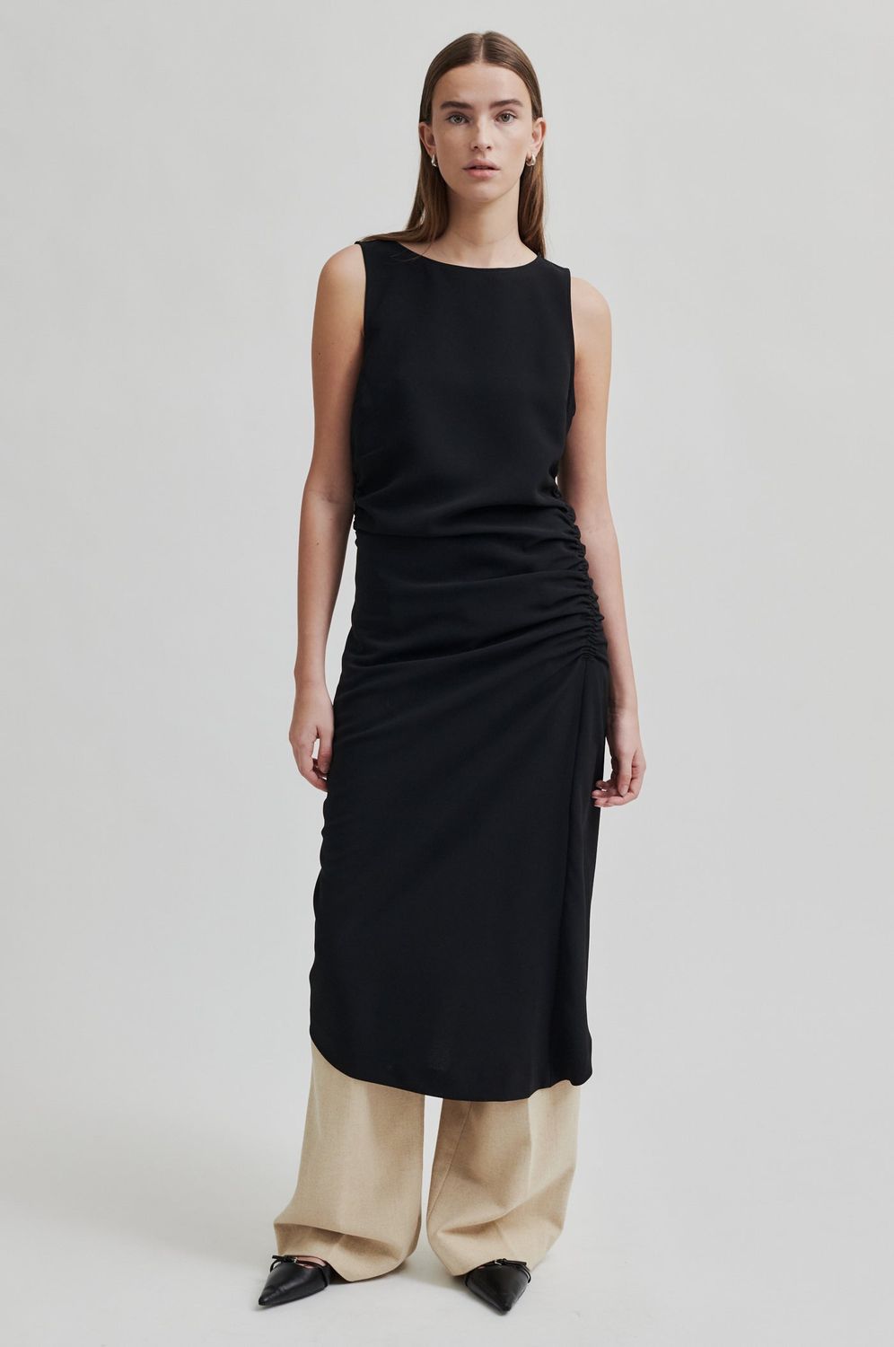 Ärmelloses Kleid von Second Female mit gerafften Seiten. Hergestellt aus einer weichen und fließenden Recycling-Mischung. Mit Rundhalsausschnitt und Reißverschluss auf der Rückseite. Geraffte Nähte, die einen drapierten Effekt erzeugen. Schlanke Passform.