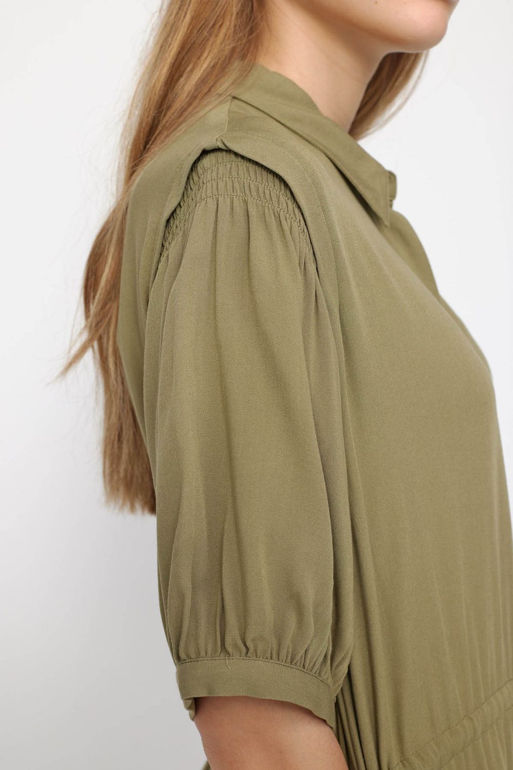 Mit Seitentaschen, innenliegendem Tunnelzug zur Betonung der Taille, Kragen, Smok-Details am oberen Ende der 2/4-Ärmel, mit Bindung und Raffungen am unteren Ende der Ärmel.