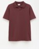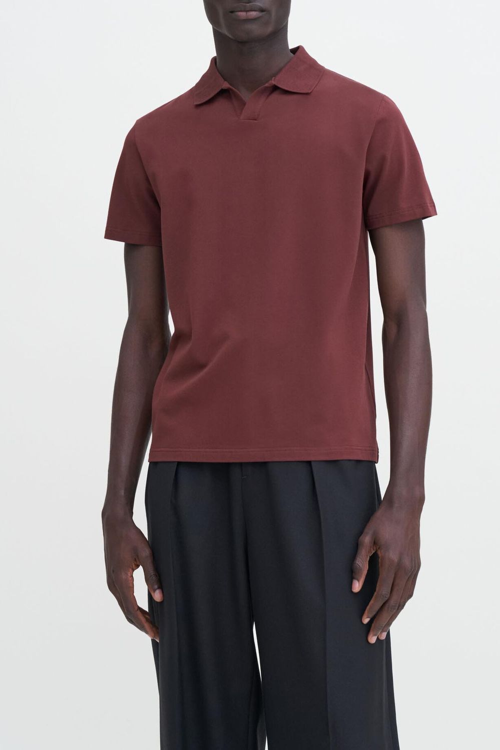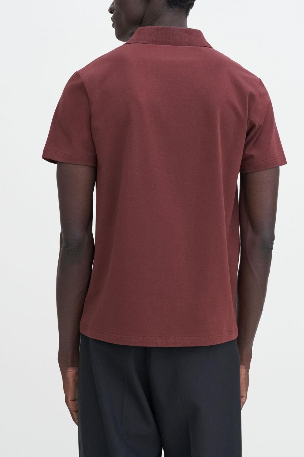 Das Stretch-Baumwoll-Polo-T-Shirt ist ein klassisches Kleidungsstück aus mahagonibrauner Bio-Stretch-Baumwolle. Es hat eine schmale Passform und einen flachen Strickkragen.