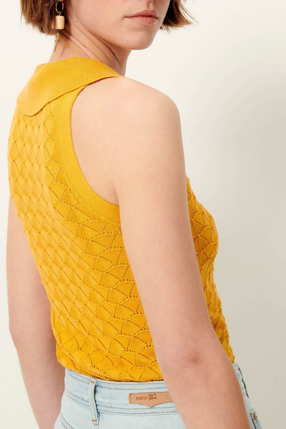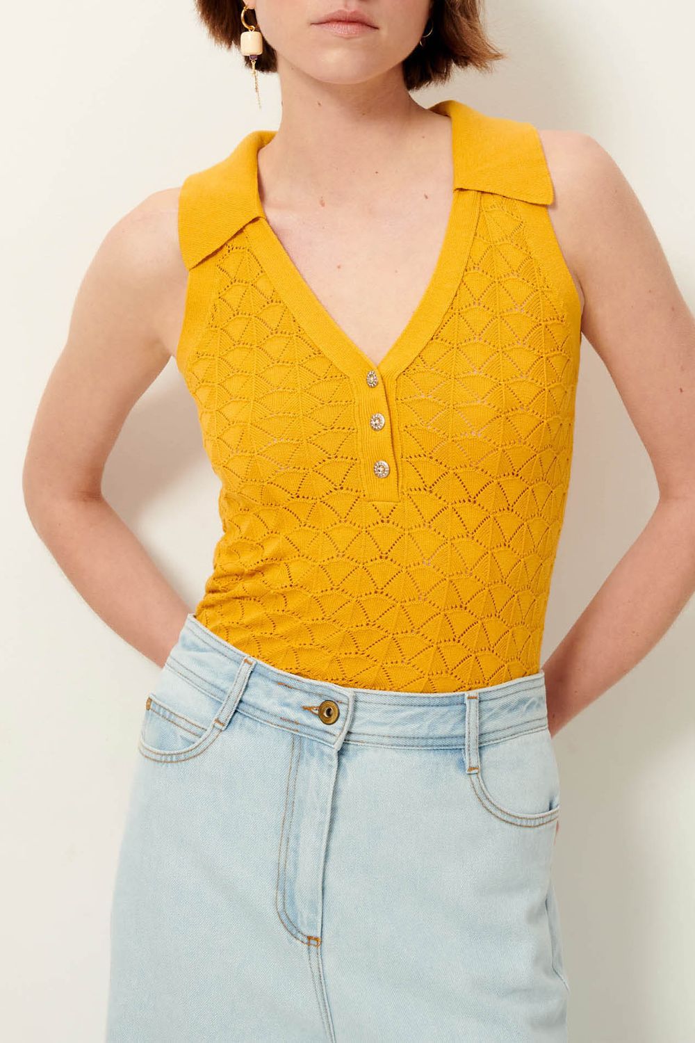 Ärmelloses Poloshirt mit V-Ausschnitt aus zartem Strick mit Muschelmuster.