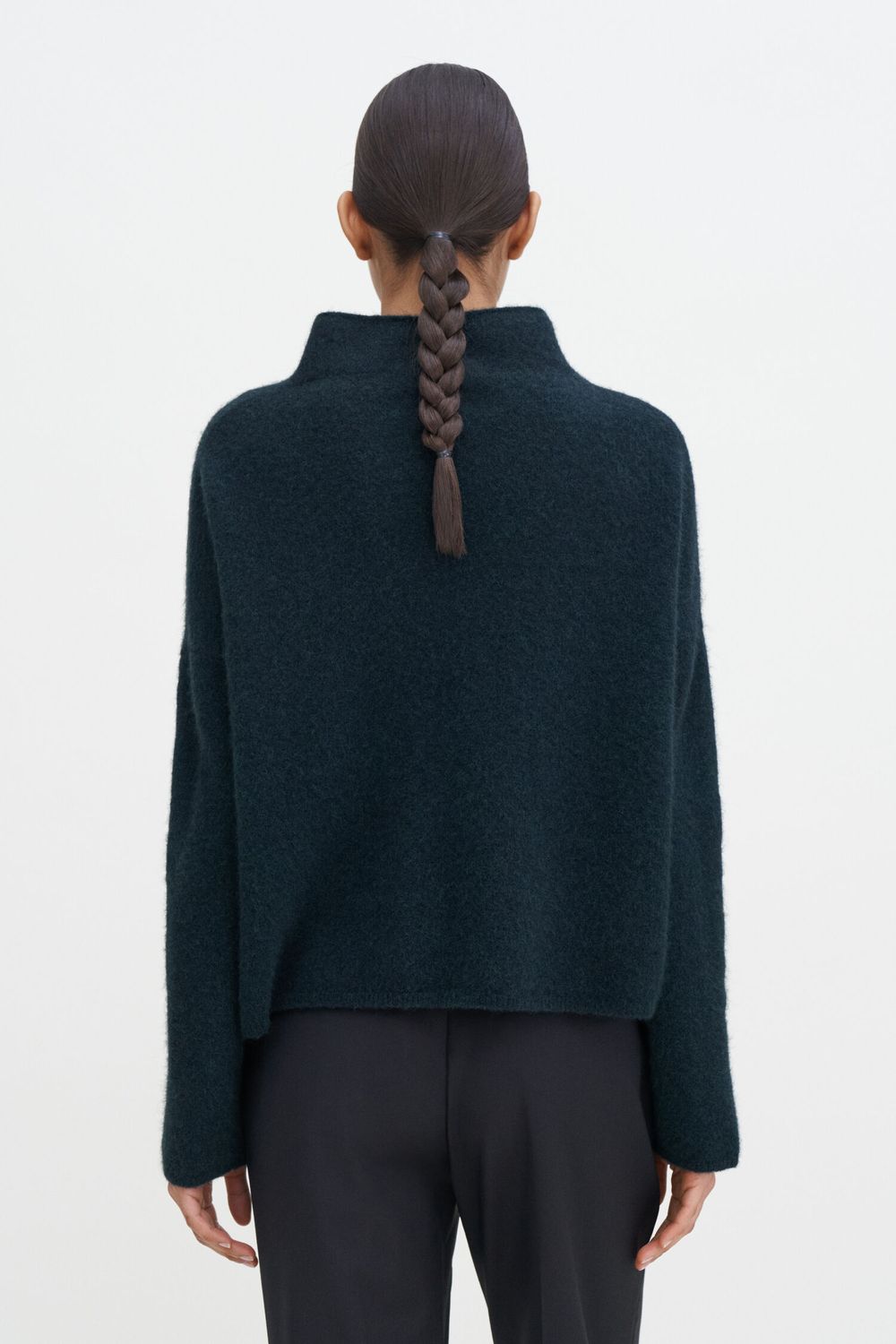 Der Mika Yak Pullover mit Trichterkragen hat eine Oversize-Passform und ist aus einer weichen Yak-Wollmischung in Waldgrün gestrickt. Neben dem hohen Kragen verfügt er über eine tief angesetzte Schulter und geht bis zur Hüfte. Trage ihn über einem T-Shirt zu einer schmalen Hose oder über den Schultern mit einem Blazer.