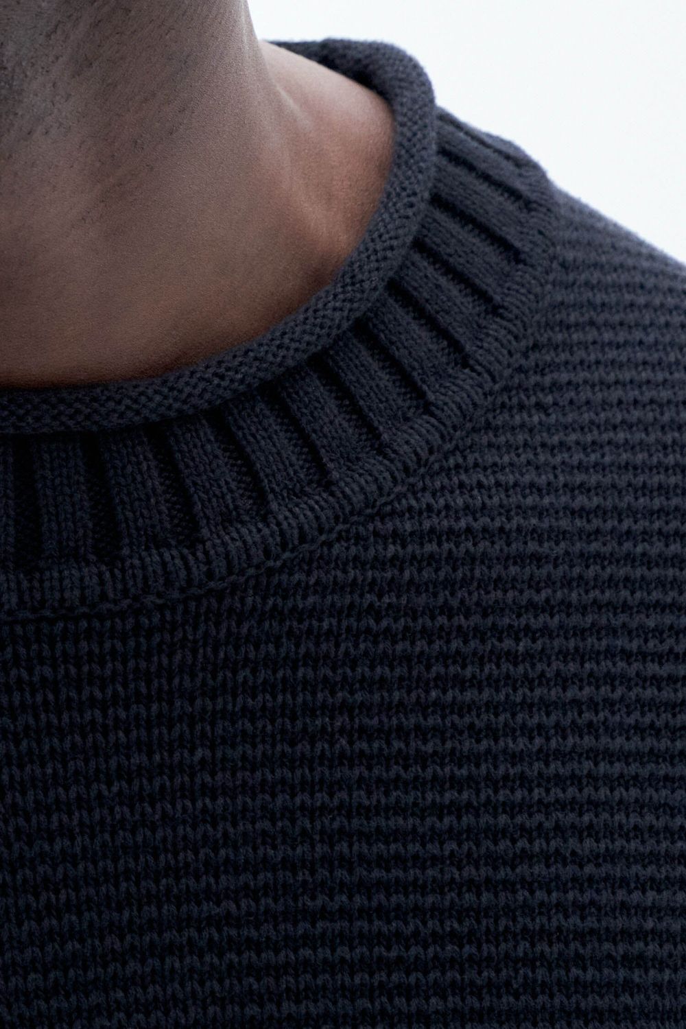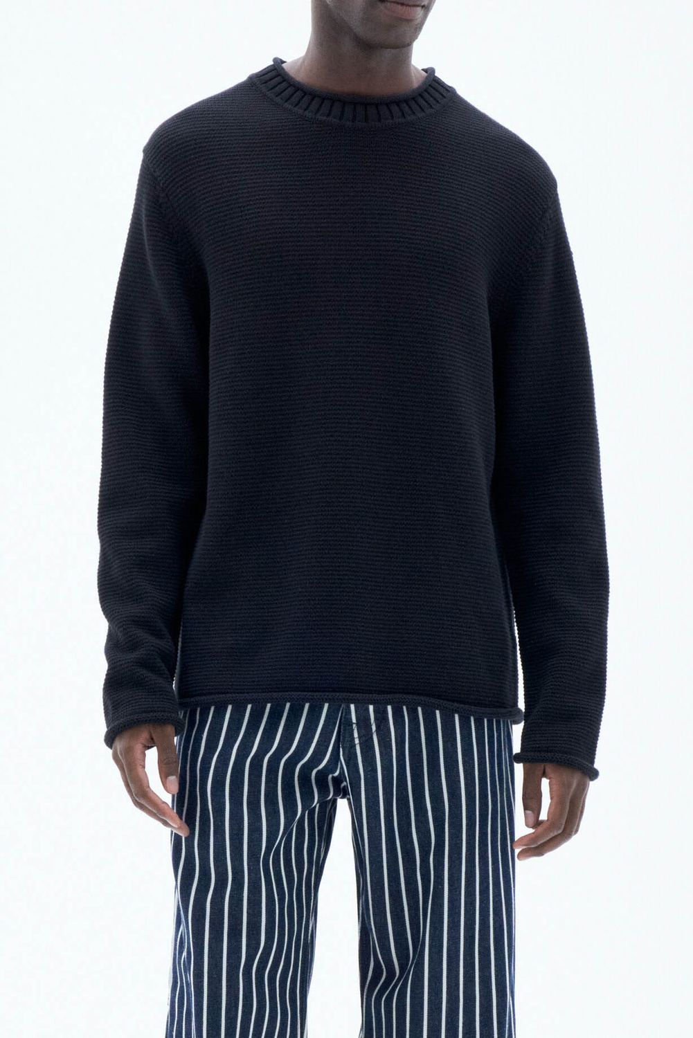 Der Rolled Hem Sweater ist aus schwerer Bio-Baumwolle in Schwarz gestrickt und wurde aus den Archiven von Filippa K neu aufgelegt. Er hat eine übergroße Passform, Rippbündchen am Halsausschnitt und Grunge-inspirierte gerollte Kanten.