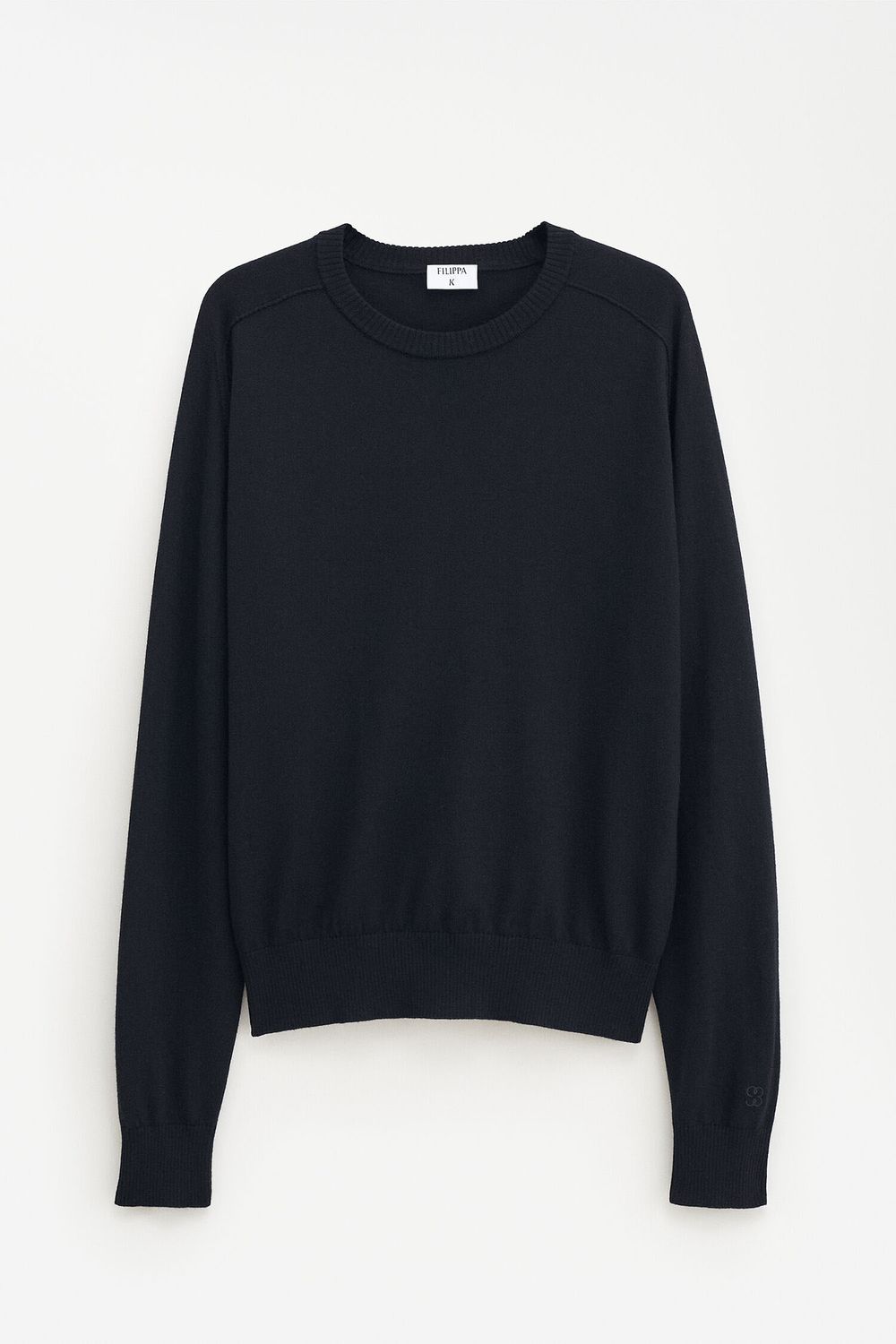 Der Inside-out Sweater in Schwarz hat eine normale Passform aus leichter Merinowolle. Der Pullover hat einen Ärmel im Hammerstil mit Inside-out-Nähten und das Filippa K 93 Monogramm auf dem linken Ärmel.