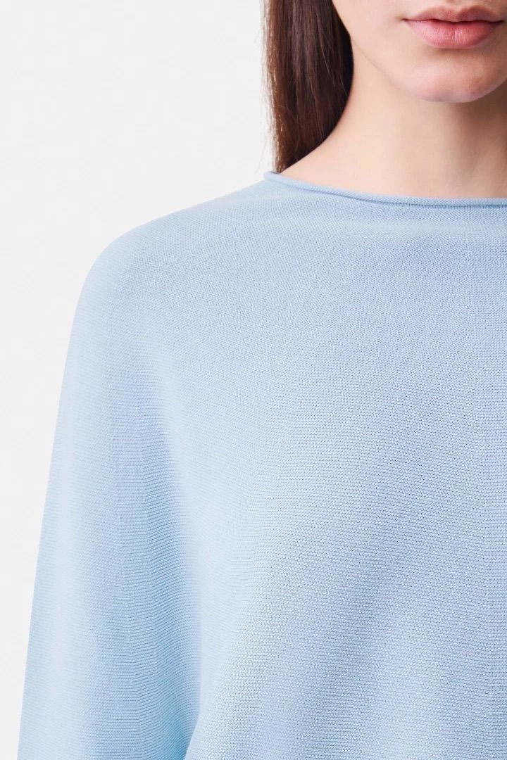 MIMAS ist ein Egg-Shape Strick Pullover mit 3/4 Ärmeln. Er hat eine verkürzte Oversized Passform und einen Rundhalsausschnitt. Hergestellt aus Baumwoll-Crêpe.