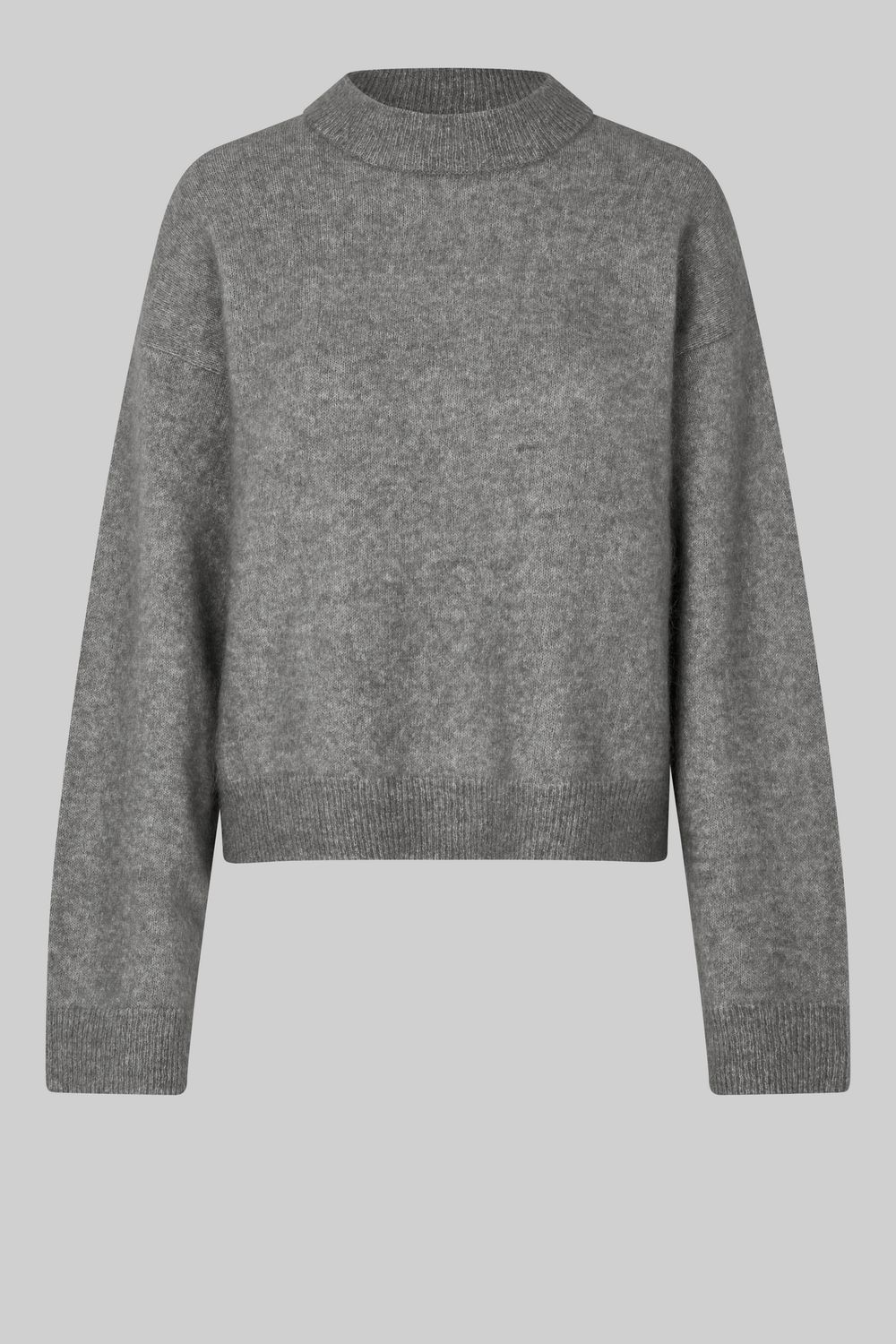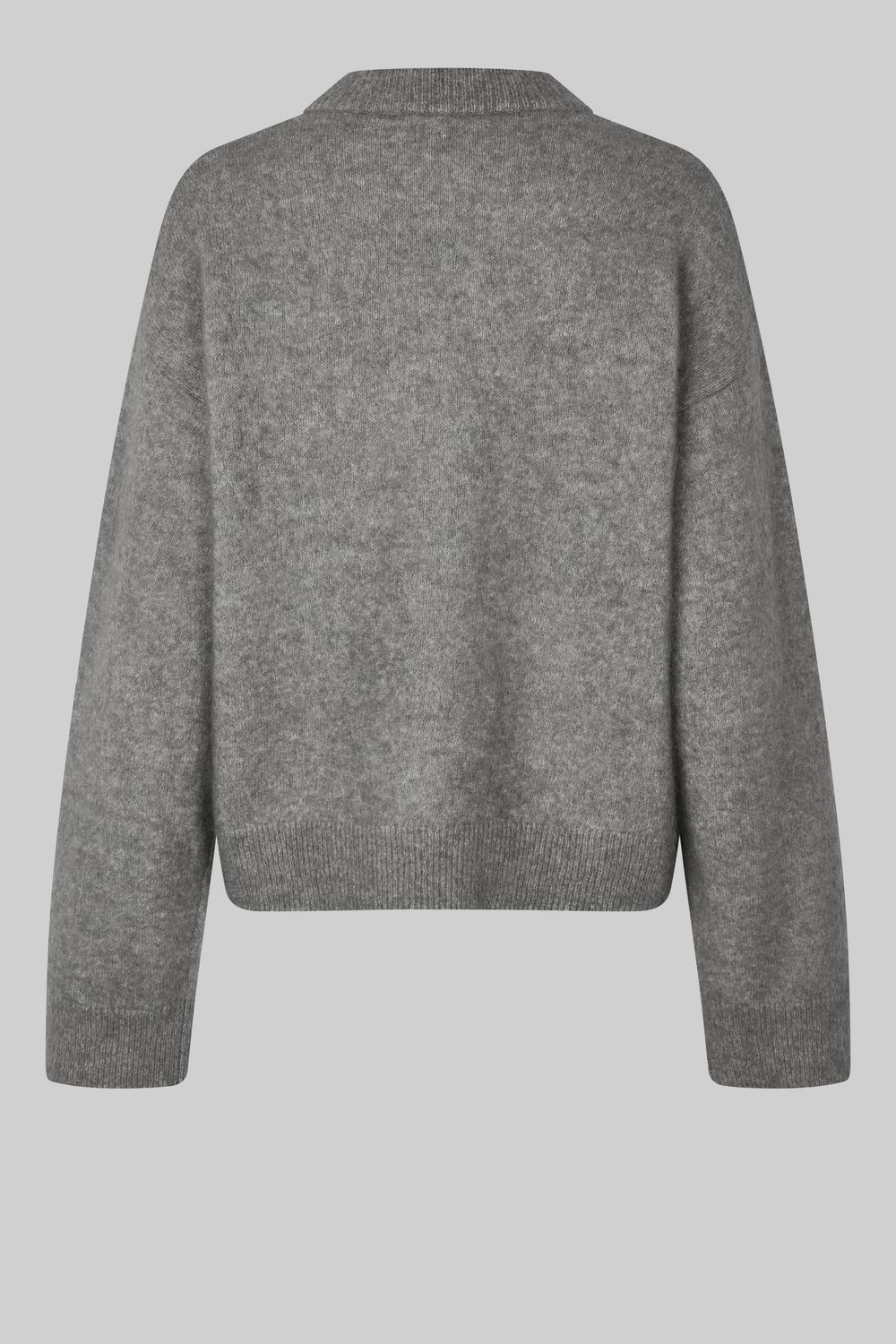 Second Female Pullover mit tiefen Schultern. Aus einer weichen und dehnbaren Mohair-Wollmischung mit leicht flauschiger Textur. Mit Rundhalsausschnitt, überschnittenen Schultern und langen Ärmeln. Gerippter Halsausschnitt, Manschetten und Saum. Etwas längerer Saum am Rücken mit kleinen Schlitzen an den Seiten. Entspannte Passform, die angenehm zu tragen ist.