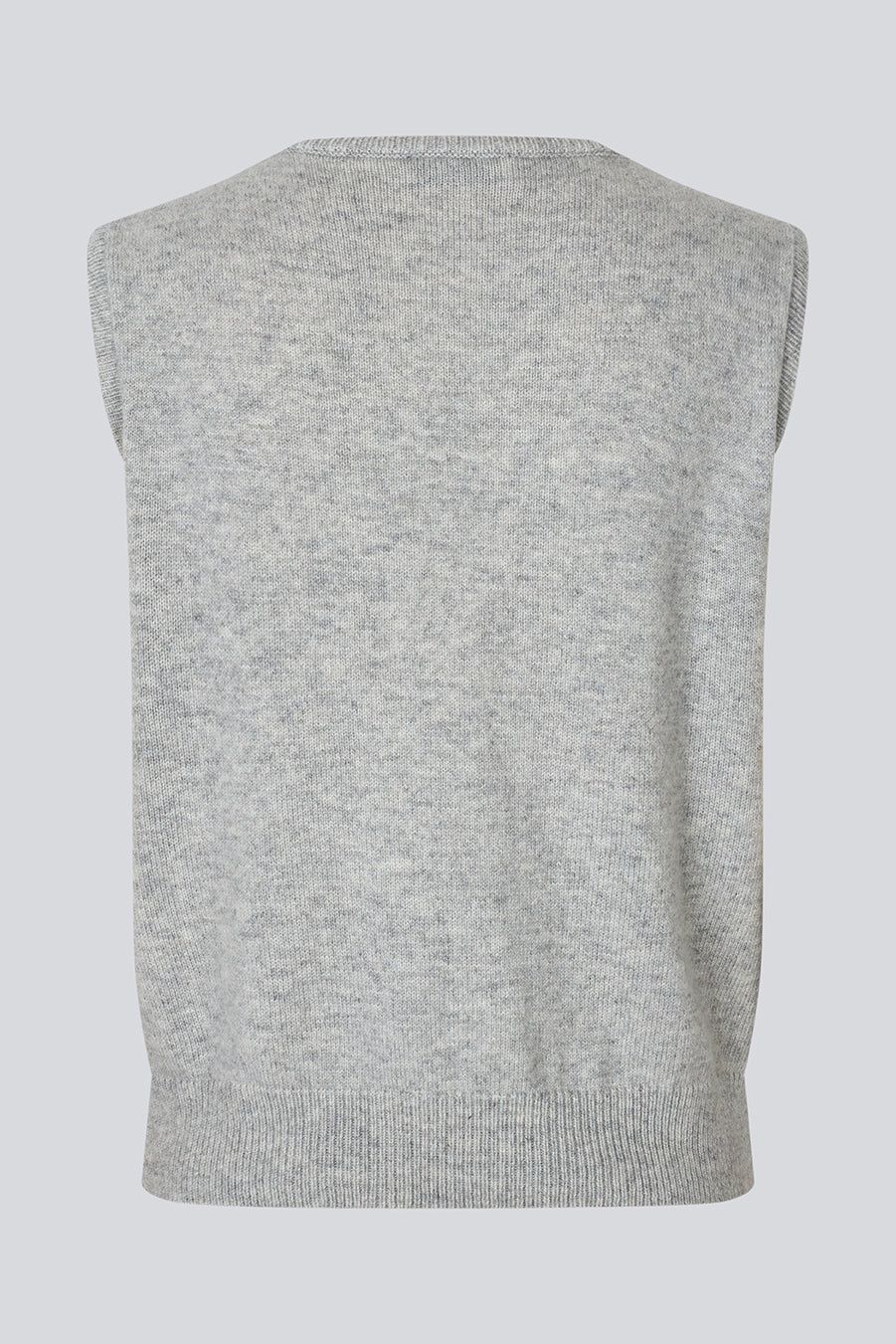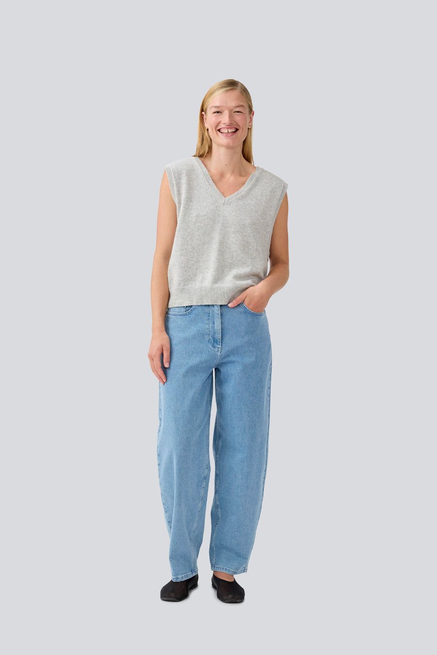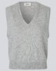 Weiche, graue Weste aus leichtem Strick. Die MayuMD-Weste hat einen V-Ausschnitt und eine lockere Passform. Das Model ist 177 cm groß und trägt die Größe S/36.