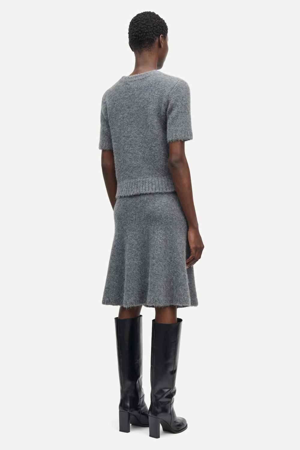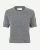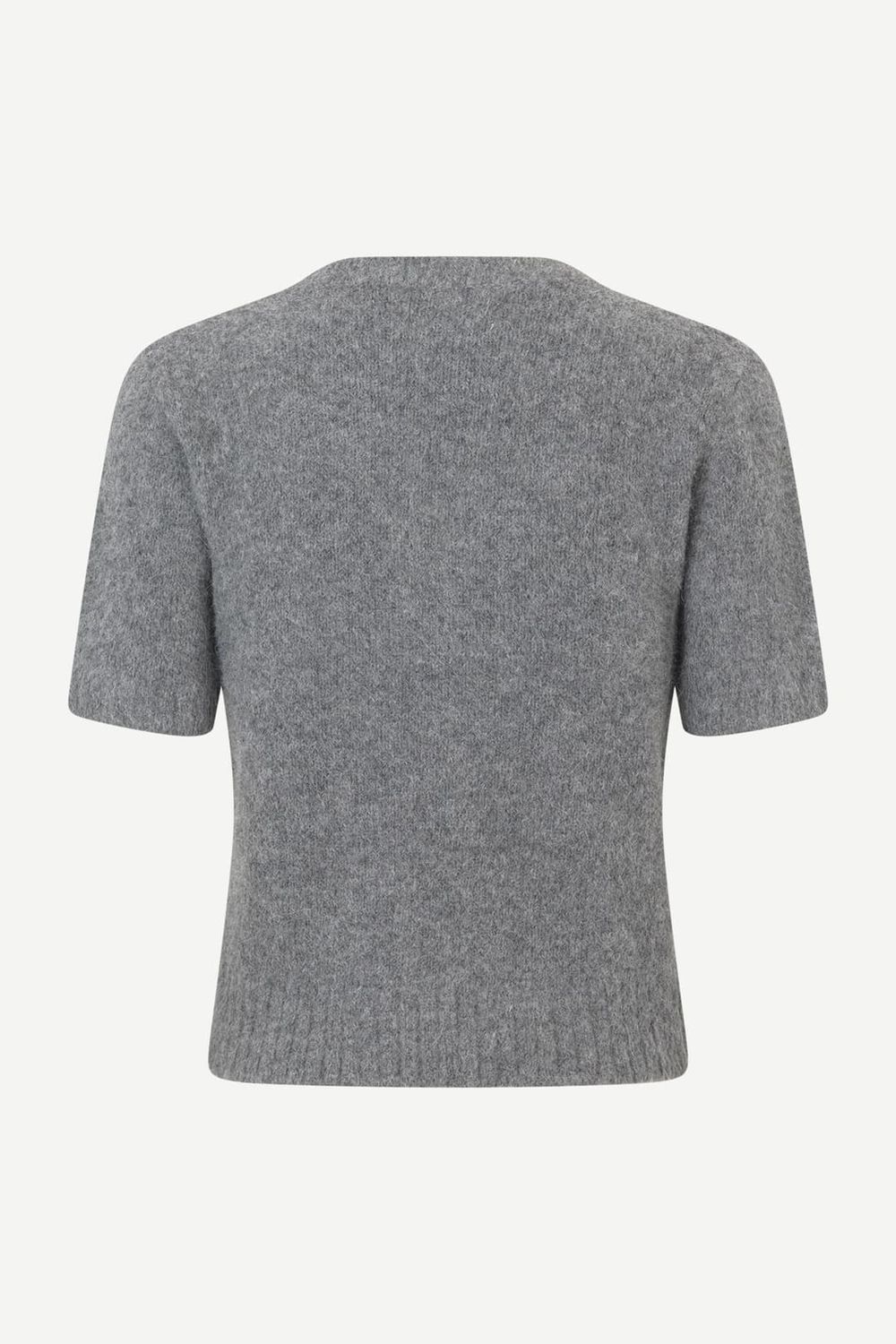 Kurzärmeliger Pullover mit normaler Passform und verkürzter Silhouette. Rippbündchen an Kragen, Ärmeln und Saum. Rundhals. Gebürsteter Look. Hauptmaterial aus elastischem Mischgewebe mit Alpakawolle.