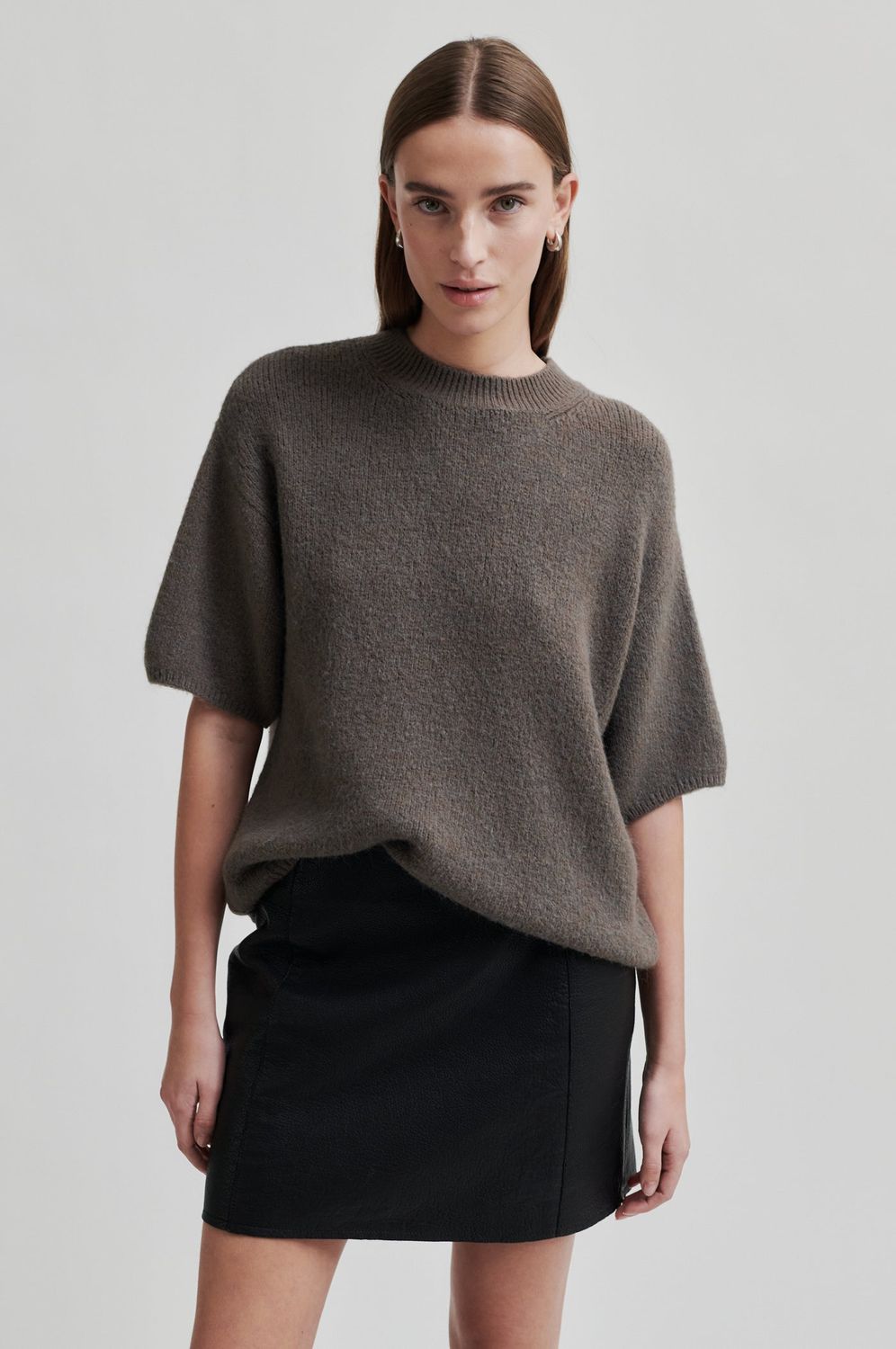 Second Female Pullover mit kurzen Ärmeln. Der Pullover ist aus einer weichen und dehnbaren Alpaka-Mischung gefertigt. Mit gerippten Abschlüssen am Hals, an den Ärmelenden und am unteren Saum. Weite und lockere Passform.