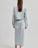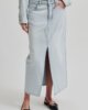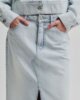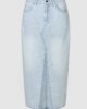 Second Female denim maxi skirt. Hergestellt aus leichtem Baumwoll-Denim mit hellblauer Waschung. Mit verdeckten Reißverschluss und Knopfverschluss am Bund. Fünf-Taschen-Stil. Farblich abgesetzte Nähte. Silberne Knöpfe und Nieten. Horizontale Nahtdetails auf der Vorderseite. Tiefer Schlitz auf der Vorderseite. In der Taille tailliert mit schmaler, gerader Silhouette.