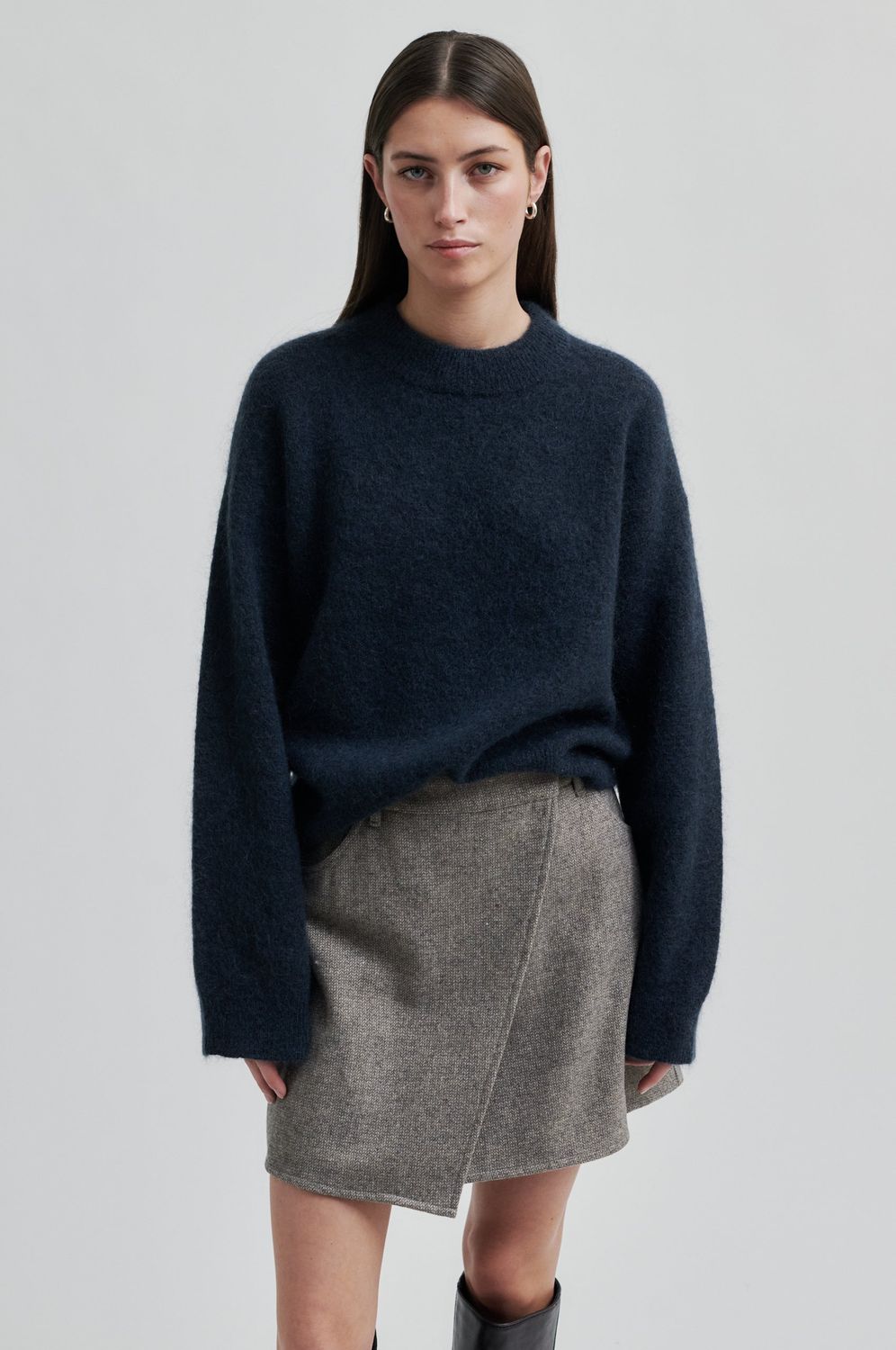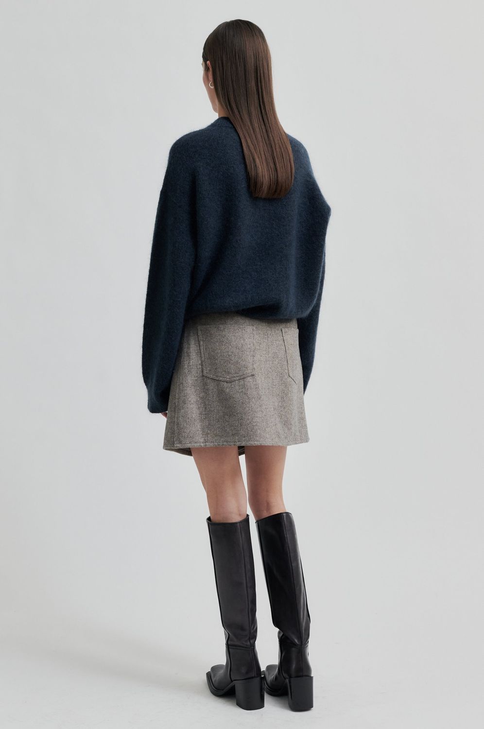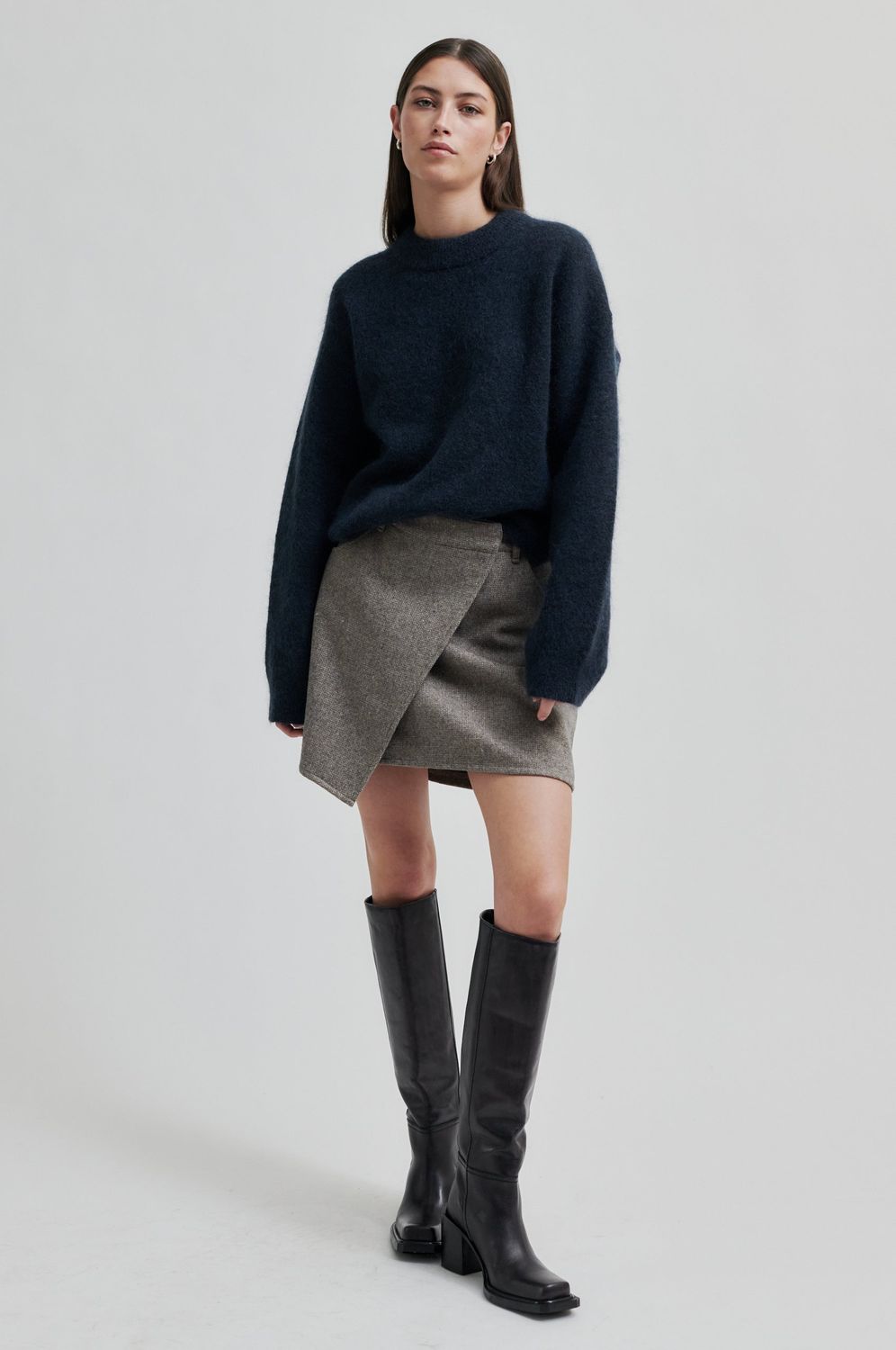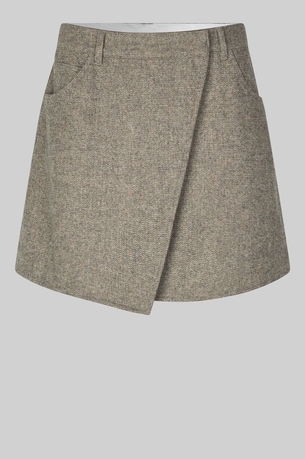 Crossover-Rock aus einer leichten Wollmischung mit Miniatur-Fischgrätmuster. Mit überkreuzter Klappe auf der Vorderseite, die auf einer Seite mit einem verdeckten Haken geschlossen wird. Kleine Münztasche, zwei Vordertaschen und zwei aufgesetzte Taschen auf der Rückseite. Vollständig gefüttert. Schlanke, kurze Passform.