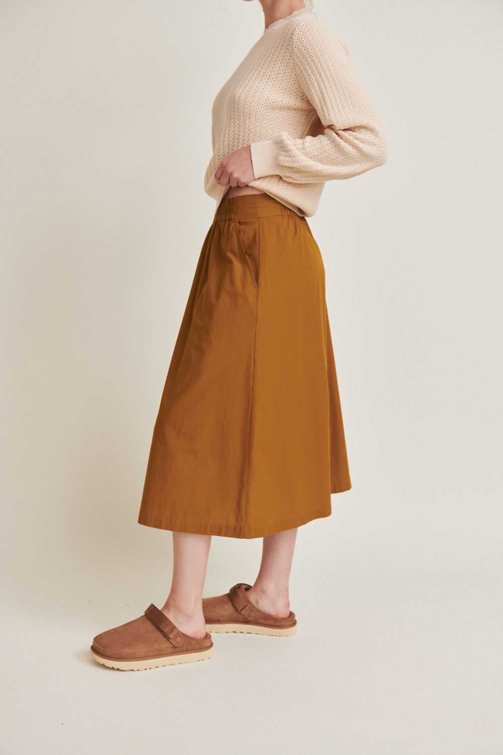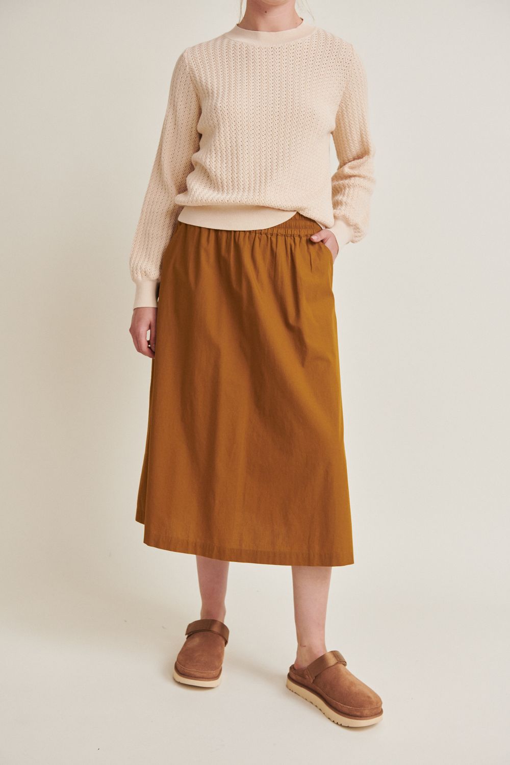 Tilde Rock besteht aus 100% Bio-Baumwolle und ist GOTS-zertifiziert. Er hat eine Midi-Länge, eine A-Linien-Silhouette, einen elastischen Bund und seitliche Taschen.