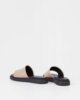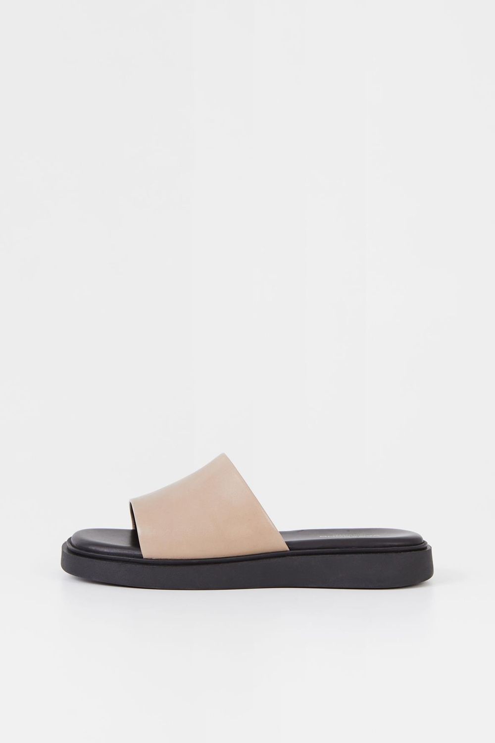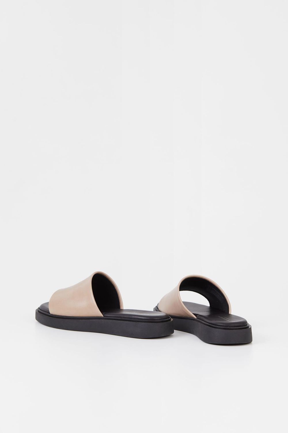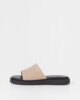 Connie ist die minimalistische Pool-Slide mit einem gepaarten Look. Das Modell ist aus beigefarbenem Leder gefertigt, hat einen einzigen Riemen, eine quadratische Zehenform und eine gepolsterte Innensohle. Die schlanken Laufsohlen messen 20 mm.
