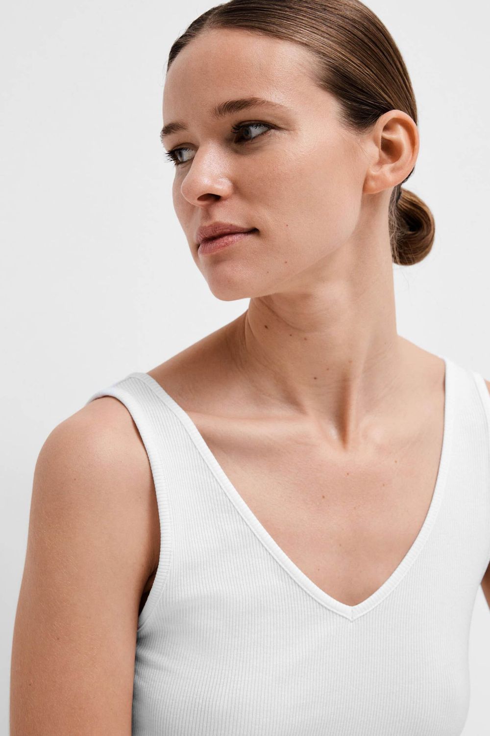 Mit einem Tanktop kannst du nichts falsch machen. Diese Variante hat einen schmeichelhaften V-Ausschnitt und besteht aus einem leichten, atmungsaktiven Stoff, der perfekt für Layer-Looks ist.