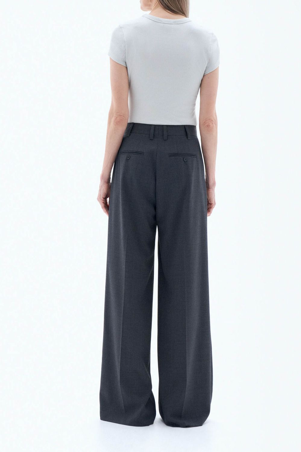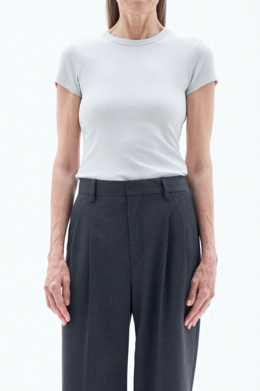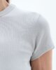Das Fine Rib Tee ist ein klassisches Kleidungsstück mit schmaler Passform aus hellgrauer gerippter Bio-Baumwolle mit Stretch-Anteil.